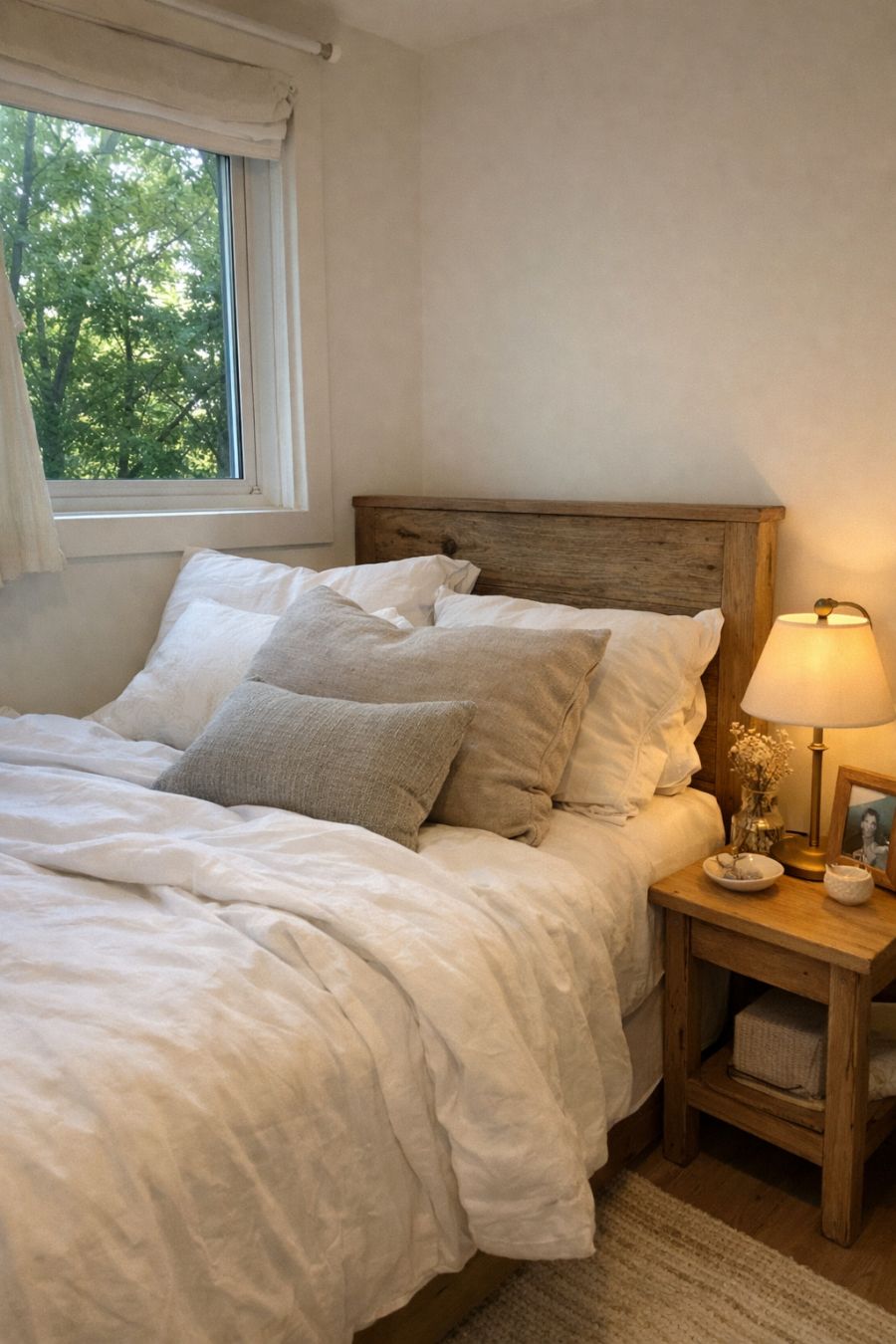 The bedroom is a cozy retreat designed with relaxation in mind. Soft, muted colors dominate the space, creating a serene and calming atmosphere. The bed, dressed in crisp white linens, is the focal point of the room, with plush pillows adding a layer of comfort. A simple wooden headboard adds a rustic touch, while a small bedside table holds a reading lamp and a few personal mementos. The room is bathed in natural light during the day, thanks to a strategically placed window that offers views of the surrounding trees, enhancing the sense of peace and tranquility.
