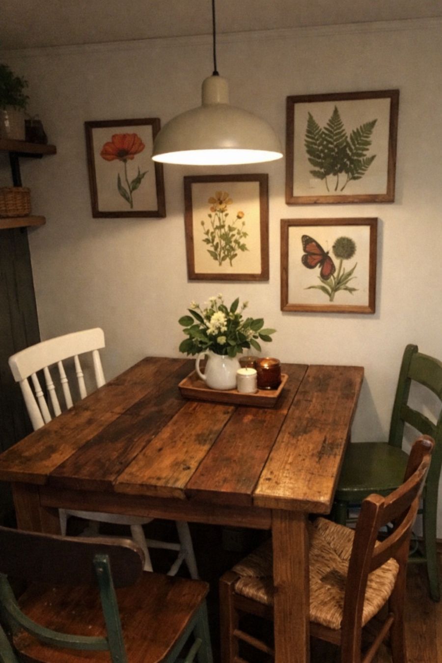 The dining area, though modest in size, is a perfect blend of functionality and style. A sturdy wooden table, crafted from reclaimed wood, serves as the centerpiece, surrounded by mismatched chairs that add an eclectic touch. Above, a simple yet elegant pendant light casts a warm glow, creating an intimate atmosphere for meals. The walls are adorned with framed botanical prints, adding a splash of color and a nod to nature. The space is thoughtfully designed to encourage shared meals and conversations, making it a cherished part of the home.
