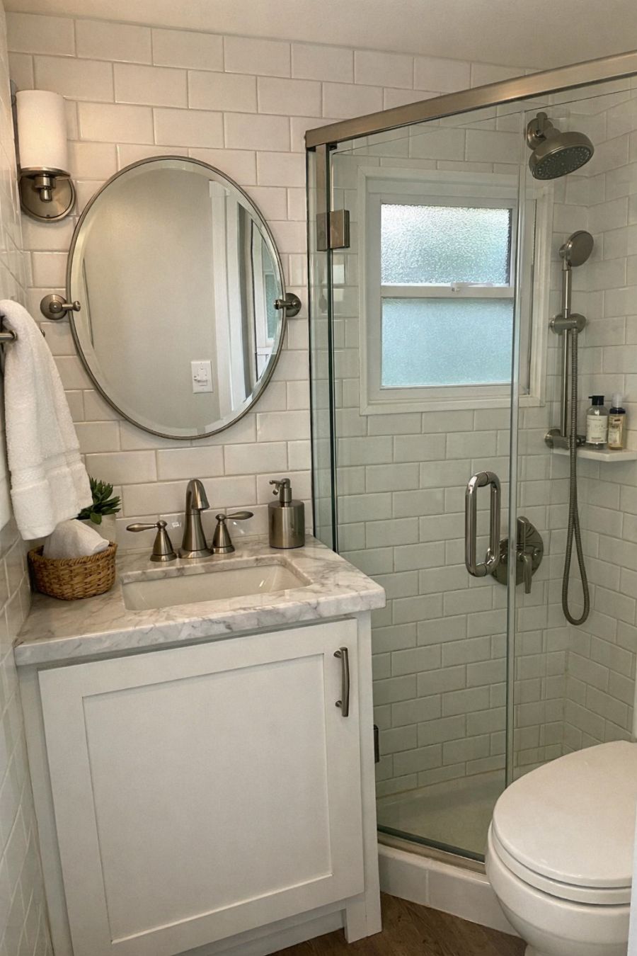 The bathroom is a study in efficient design, combining style and functionality seamlessly. The walls are covered in white subway tiles that reflect light, making the space feel larger and brighter. A compact, yet elegant vanity provides storage without crowding the room, topped with a sleek marble countertop that adds a touch of luxury. The brushed nickel fixtures offer a modern contrast to the traditional elements, while a frameless glass shower enclosure keeps the space feeling open. A small, frosted window ensures privacy while allowing natural light to filter in, creating a soothing, spa-like atmosphere.