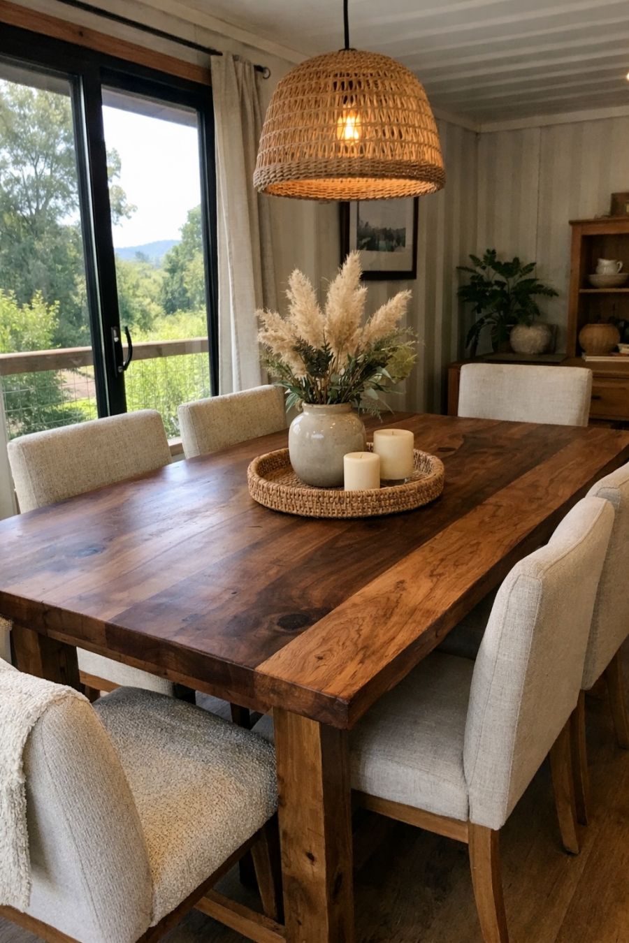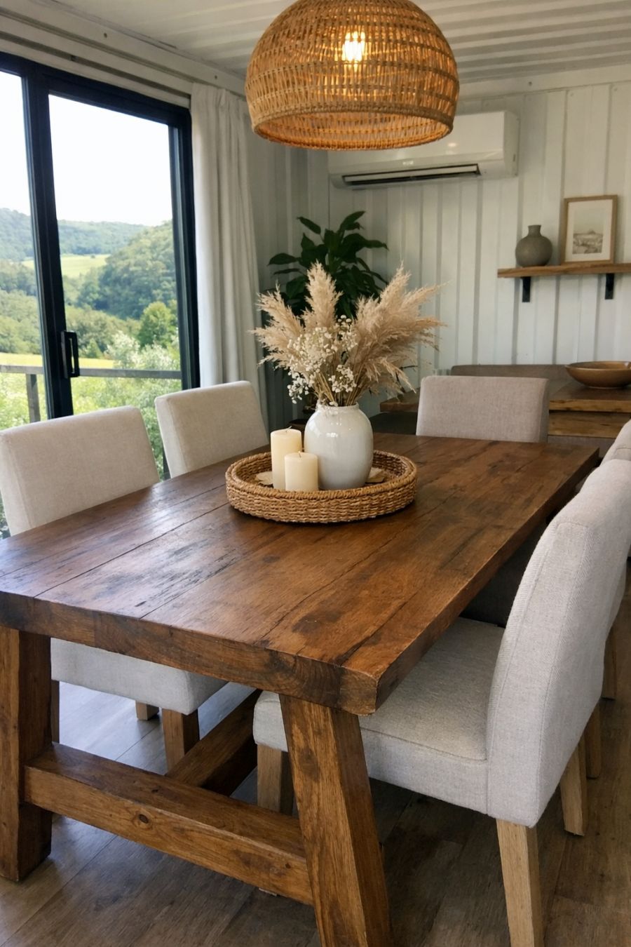 The dining area is a continuation of the home's harmonious design, offering a welcoming space for family gatherings and meals. A handcrafted wooden dining table takes center stage, complemented by elegant chairs upholstered in soft, natural fabrics. Large windows provide an abundance of natural light and offer picturesque views of the surrounding landscape. The room is accented with simple yet tasteful decor, emphasizing the beauty of the natural materials and craftsmanship.