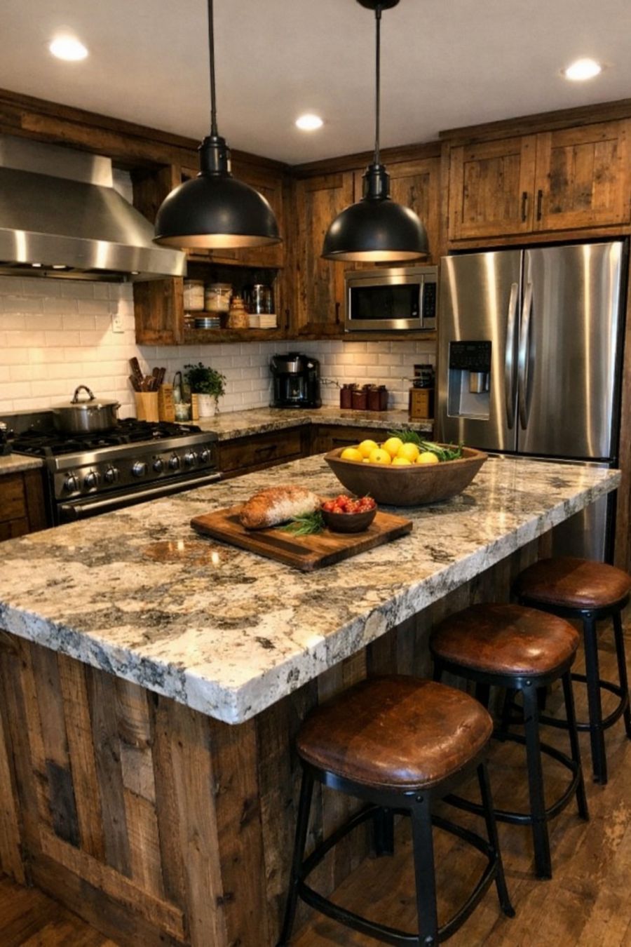 The kitchen is a chef's dream, featuring modern appliances seamlessly integrated into the rustic design. Custom cabinetry made from reclaimed wood provides ample storage while adding a touch of history and character to the space. A large center island with a natural stone countertop serves as both a functional workspace and a casual dining area. The kitchen's open layout ensures that it is both practical and inviting, making it the heart of the home.