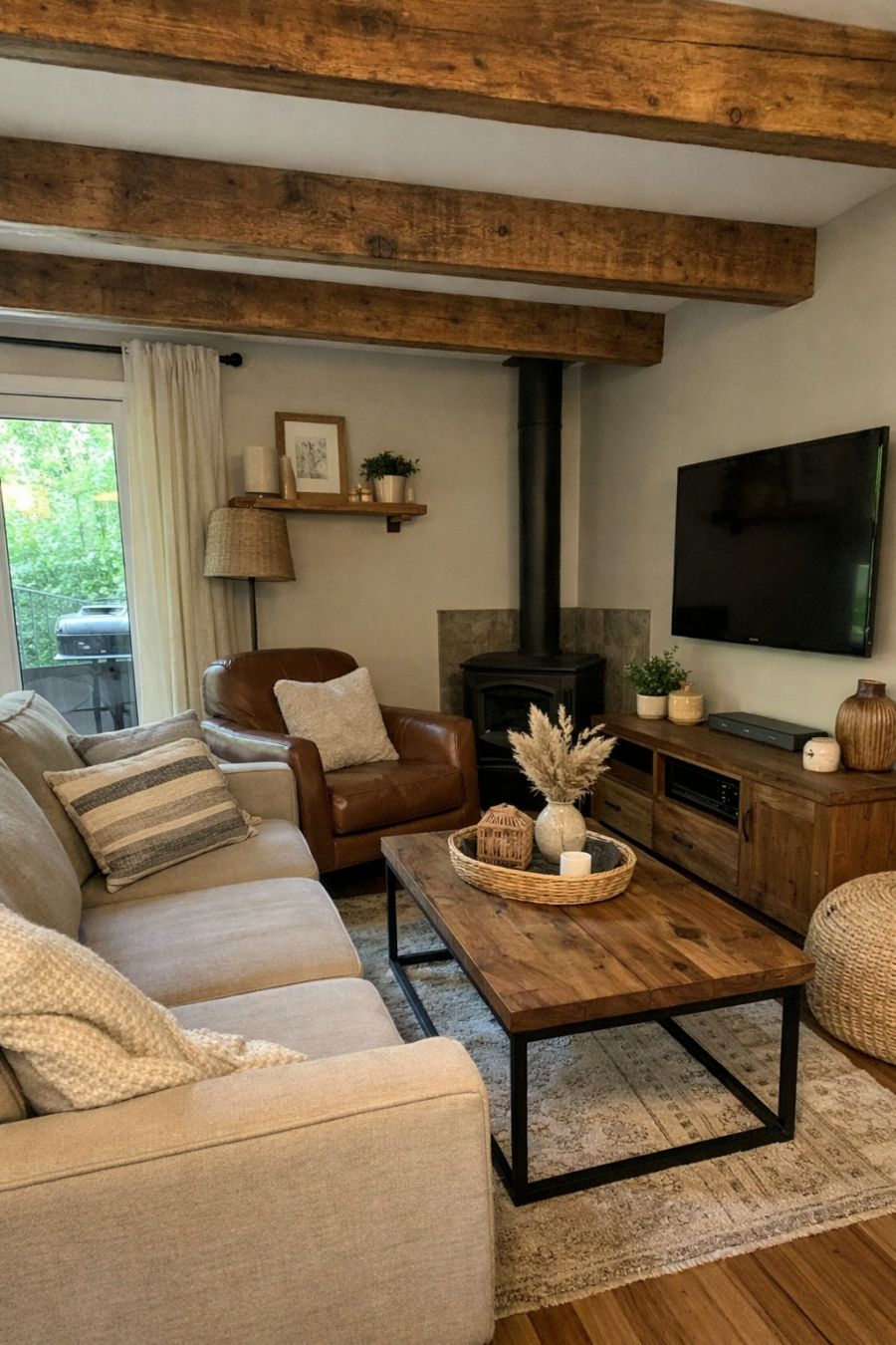 Upon entering the living area, you are greeted by an open and airy space filled with natural light. The interior design features a blend of rustic and contemporary elements, with exposed wooden beams adding character and warmth to the room. The walls are adorned with neutral tones that complement the natural wood flooring, creating a cohesive and inviting atmosphere. Comfortable seating arrangements and carefully curated decor pieces complete the space, making it perfect for relaxation and entertaining.