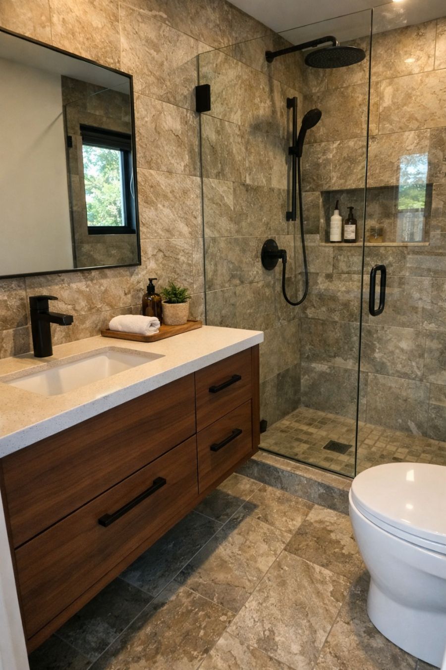 The bathroom is a blend of functionality and style, featuring high-quality materials and thoughtful design. Natural stone tiles line the floor and walls, creating a spa-like atmosphere that is both calming and elegant. The fixtures are chosen for their sleek design and efficiency, including a modern vanity with ample storage and a walk-in shower with a frameless glass enclosure. The use of natural light and a well-planned layout ensure that the space feels open and serene.