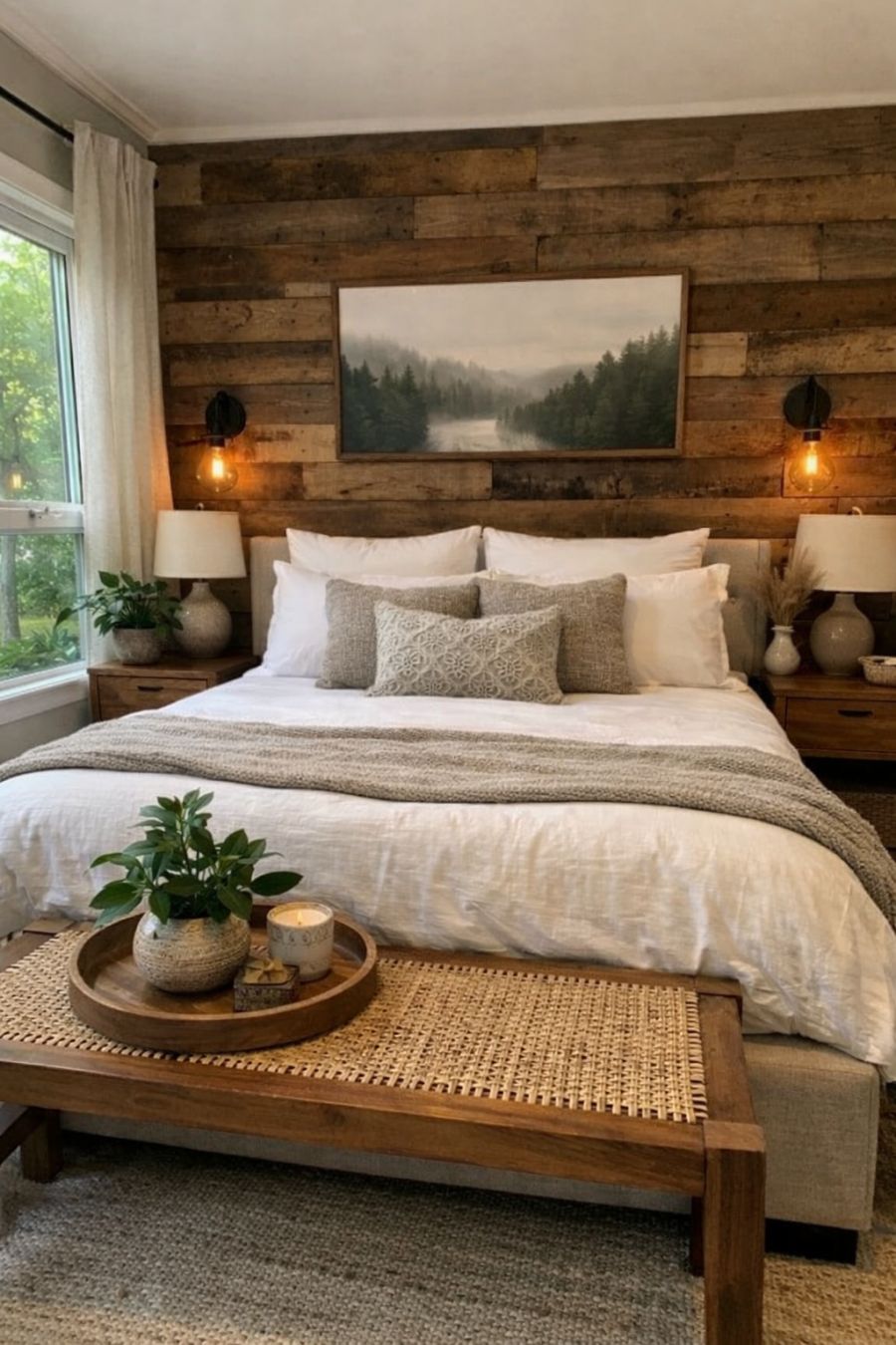 The master suite is a testament to the attention to detail that defines this home, offering a sanctuary of comfort and tranquility. The room is designed with a focus on natural materials, featuring a reclaimed wood accent wall that adds warmth and texture. Large windows fill the space with soft, natural light, highlighting the carefully chosen furnishings and decor. The neutral color palette is accented with touches of greenery, creating a peaceful and rejuvenating environment.