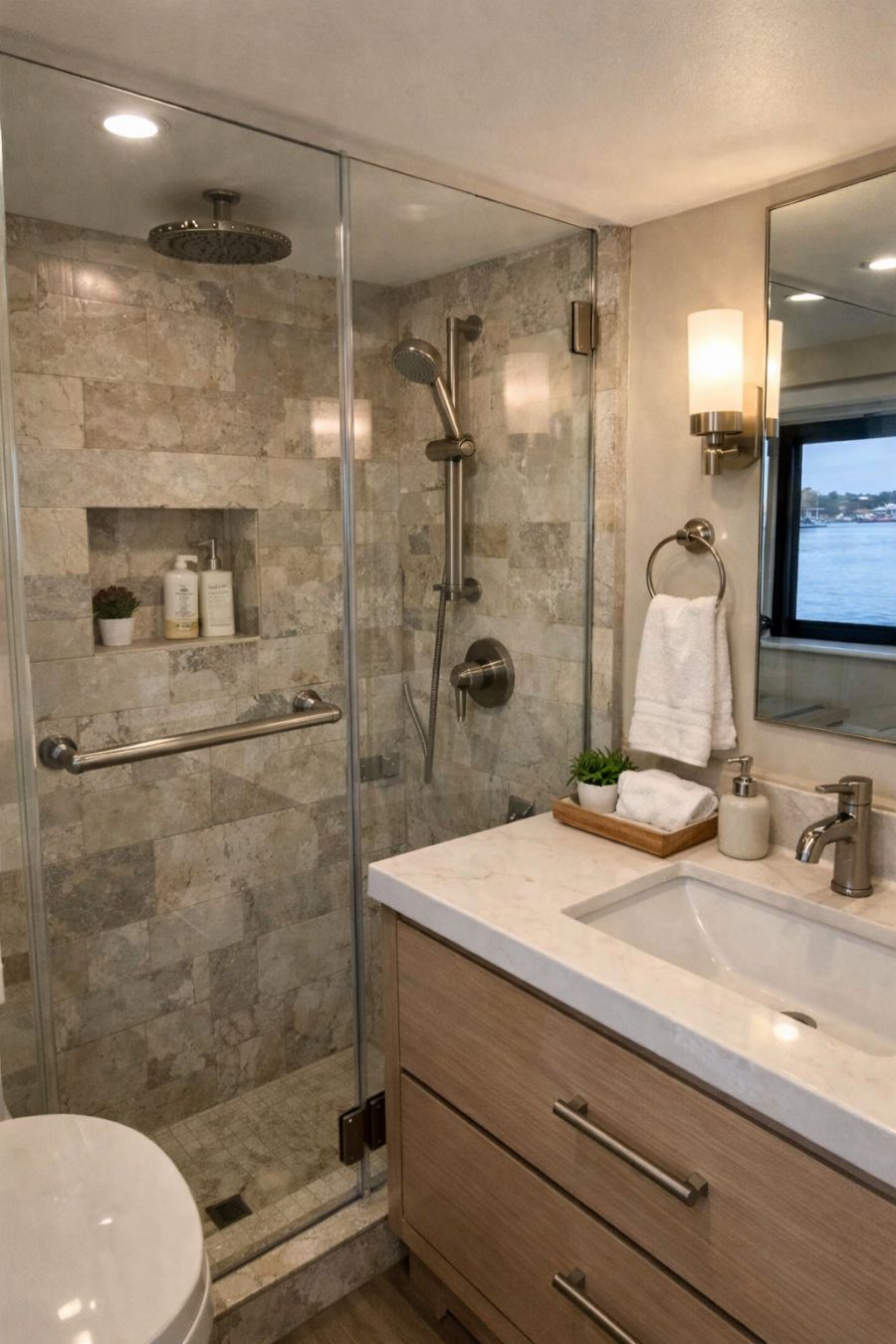 The bathroom in this floating home is a sanctuary of modern design and functionality. It features a spacious walk-in shower with glass doors, adorned with natural stone tiles that evoke a spa-like feel. The vanity is sleek and minimalist, with ample counter space and elegant fixtures in brushed nickel. Soft, ambient lighting enhances the calming atmosphere, while the use of mirrors and light colors makes the space feel larger and more open. Each element is carefully chosen to ensure accessibility and ease of use, making the bathroom both practical and beautiful.