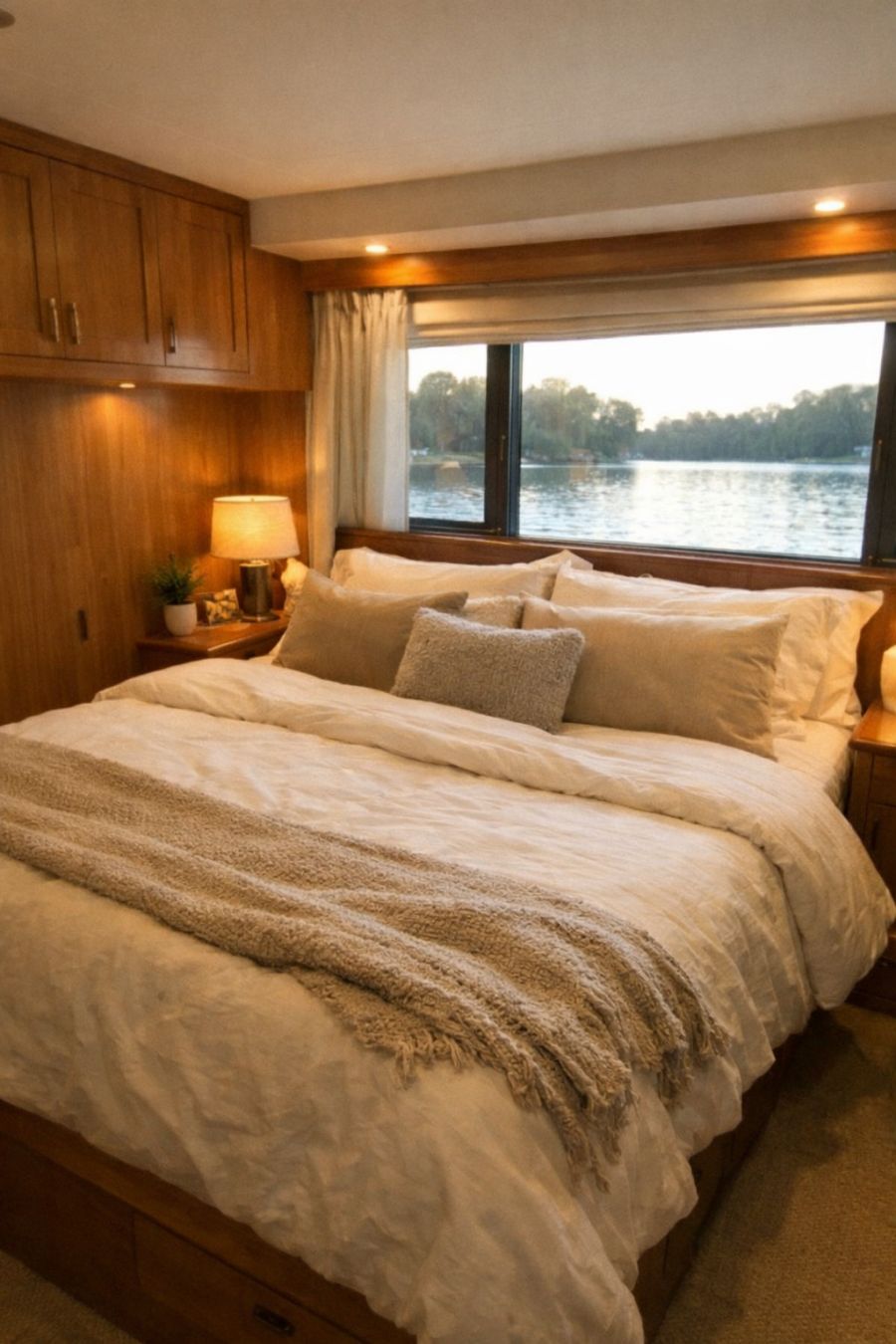 In the bedroom, tranquility is the theme, with a design that prioritizes comfort and relaxation. A plush, king-sized bed takes center stage, draped in luxurious linens and positioned to take advantage of the water views through generous windows. Soft lighting and warm wood tones add to the serene ambiance, while built-in wardrobes offer ample storage without disrupting the room's clean lines. The result is a peaceful retreat where one can unwind and recharge.