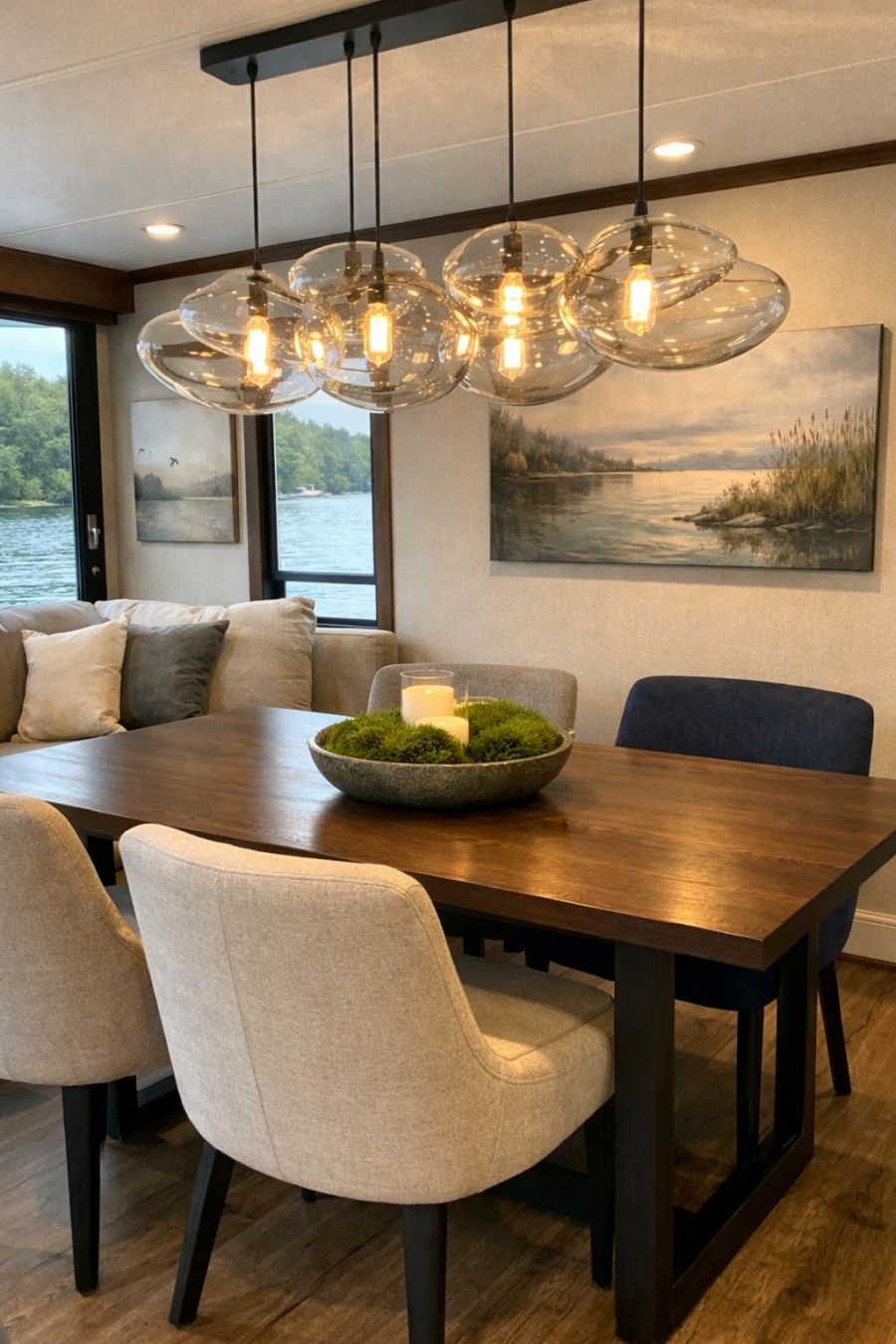 The dining area seamlessly connects to the living space, offering a continuation of the home's elegant style. A sleek, modern dining table is surrounded by comfortable chairs, inviting family and friends to gather for meals. Overhead, a statement light fixture adds a touch of sophistication, while the walls are adorned with subtle artwork that reflects the beauty of the natural surroundings. The thoughtful design ensures that the dining space feels intimate yet open, perfect for both casual dinners and formal gatherings.