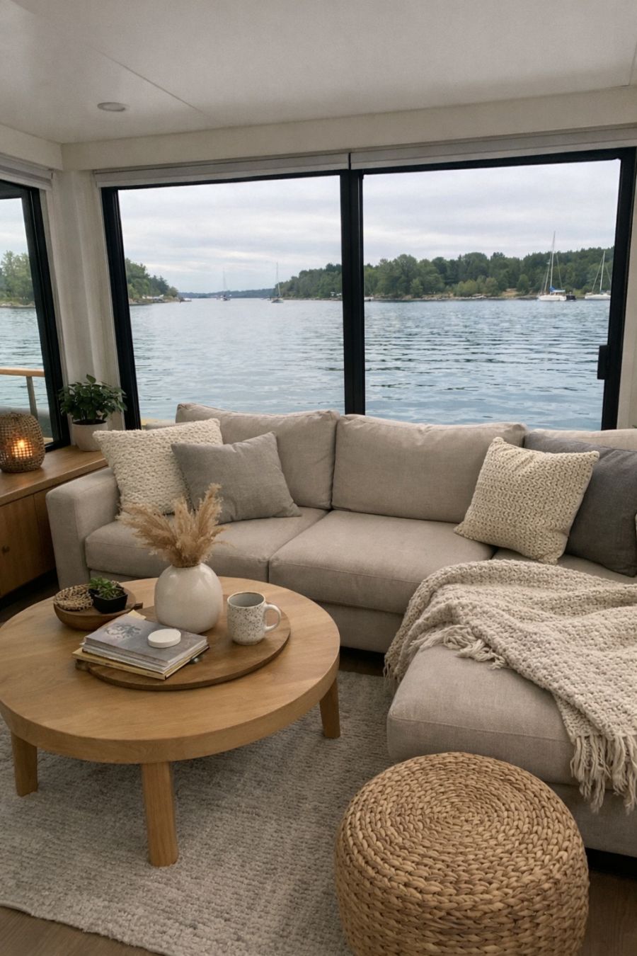 Stepping inside, the living area greets you with an open and airy design. Large, floor-to-ceiling windows flood the space with natural light, providing a panoramic view of the surrounding water. The interior style is a blend of modern minimalism and cozy comfort, with sleek furniture pieces complemented by soft, textured throws and cushions. Neutral tones dominate the palette, creating a calming atmosphere perfect for relaxation or entertaining guests.