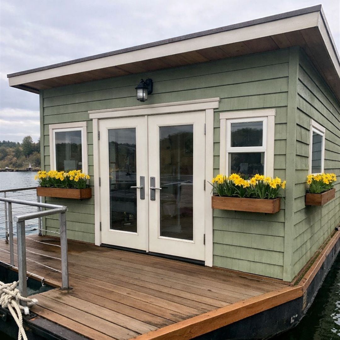 The exterior of this stunning houseboat is clad in sage green cedar plank siding, offering a harmonious blend with the natural surroundings. The wide lever-handle entry doors ensure easy access for everyone, emphasizing the home's commitment to accessibility. Window boxes overflow with vibrant yellow daffodils, adding a cheerful touch of color and a connection to the natural beauty around. From a 3/4 angled view, the houseboat presents a charming and inviting facade, captured beautifully in a piece of amateur photography.