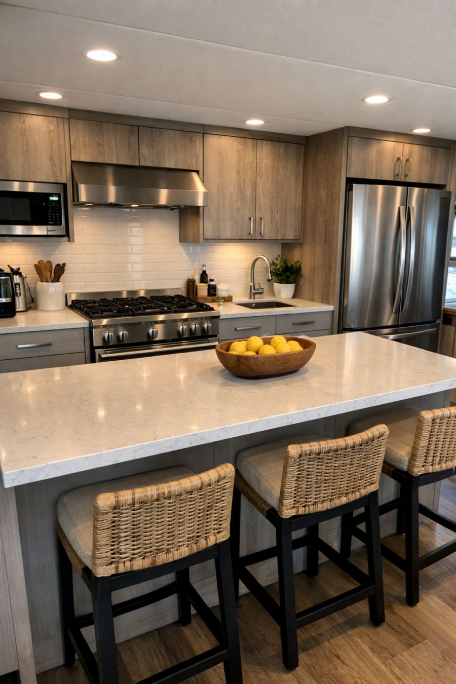 The kitchen is a chef’s dream, designed with both functionality and style in mind. High-end stainless steel appliances are set against a backdrop of sleek cabinetry and quartz countertops. An island provides ample space for meal preparation, complete with bar seating for casual dining. The use of muted colors and natural materials creates a seamless flow with the rest of the home, while clever storage solutions keep the space uncluttered and efficient.