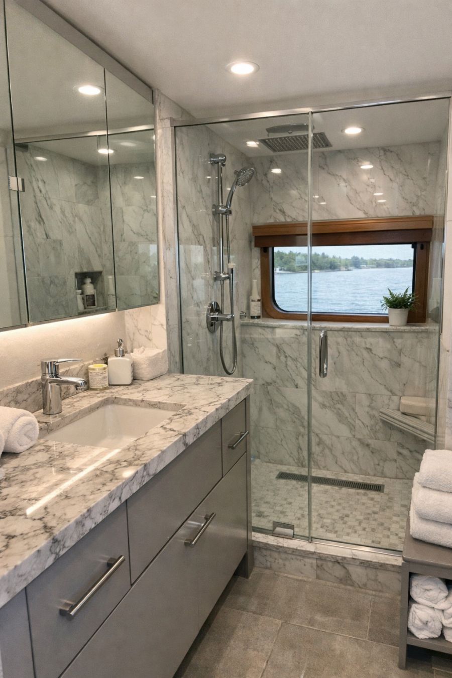 The bathroom in this houseboat is a sanctuary of modern design and functionality. With its sleek lines and contemporary fixtures, the space is both stylish and practical. The materials used include polished marble for the countertops and shower walls, adding a touch of luxury. A spacious walk-in shower with a glass enclosure offers accessibility without compromising on design. The color scheme of soft whites and grays creates a calming environment, while strategically placed lighting ensures the space is bright and inviting. Thoughtful details, such as heated flooring and ample storage, make this bathroom a true retreat.