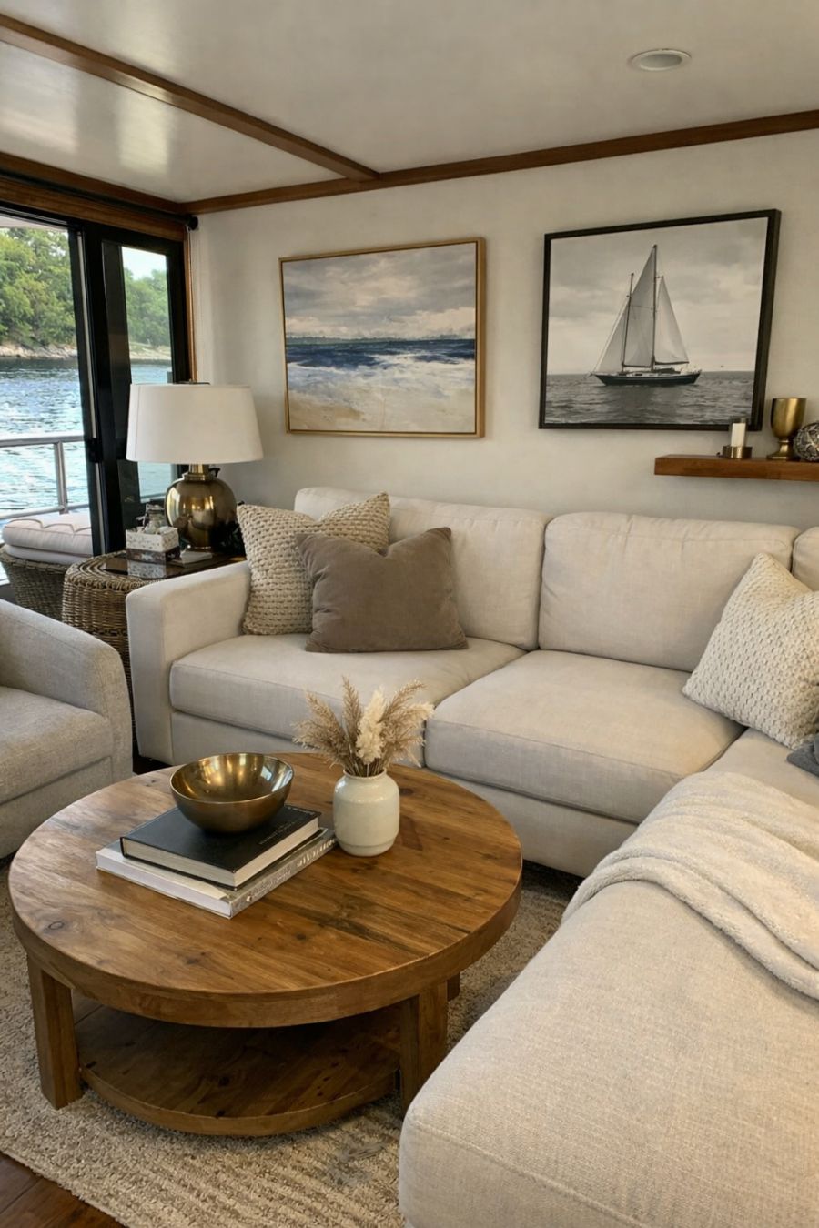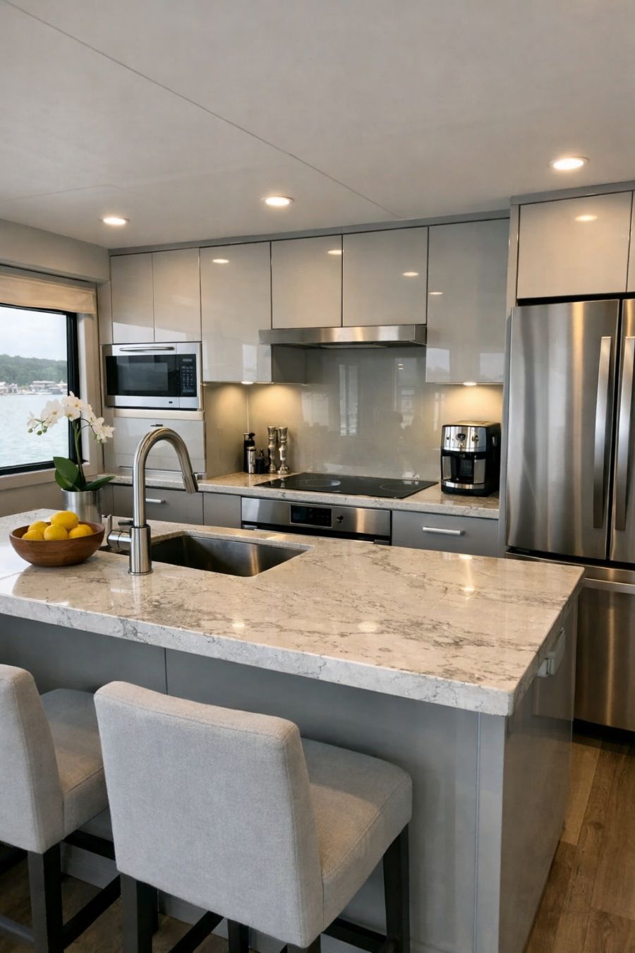 Adjacent to the living area, the dining space is a seamless extension of the houseboat's elegant design. A minimalist dining table, crafted from reclaimed wood, sits at the center, surrounded by chic chairs that offer both style and comfort. Pendant lights hang overhead, casting a warm glow that enhances the intimate atmosphere. The use of subtle nautical motifs in the decor pays homage to the boat's setting, while floor-to-ceiling windows provide a stunning backdrop for every meal. This dining area is designed for both casual family dinners and sophisticated gatherings.