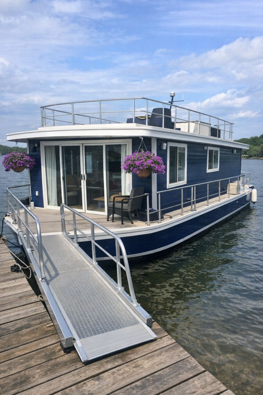 The exterior of this houseboat is a striking combination of practicality and beauty, featuring a deep navy blue hull that exudes sophistication and stability. Wide sliding glass doors invite you inside while offering uninterrupted views of the surrounding water. Hanging baskets of vibrant purple petunias add a touch of nature and color, contrasting beautifully with the boat's sleek lines. A smooth ramp entry offers easy access, making this houseboat truly barrier-free. Captured from a 3/4 angled view, the amateur photography lends an authentic feel to this modern maritime marvel.