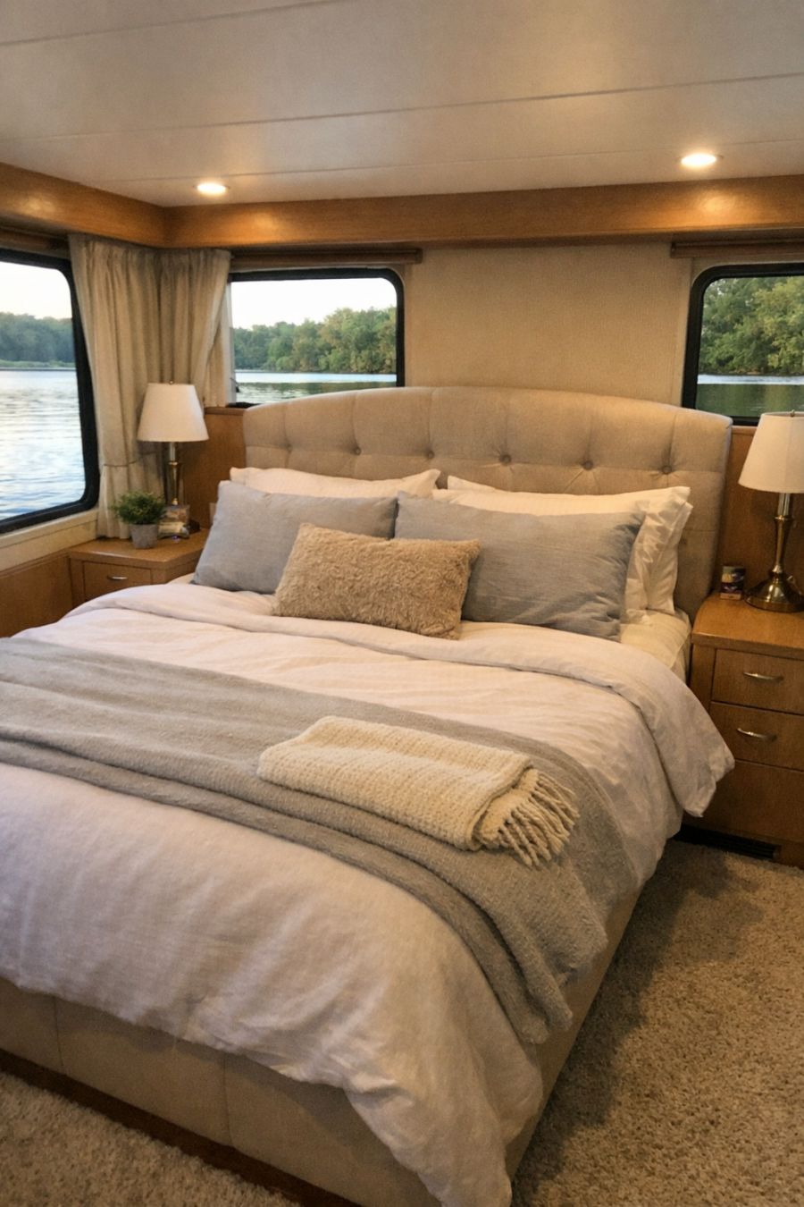 The bedroom is a tranquil retreat, designed to offer the ultimate in comfort and relaxation. The centerpiece is a king-sized bed with a plush headboard, dressed in luxurious linens that invite restful sleep. Large windows frame the serene views outside, allowing natural light to fill the space during the day. Soft carpeting underfoot adds an extra layer of coziness, while built-in storage solutions keep the room tidy and organized. The decor is understated yet elegant, with a calming color palette that enhances the peaceful atmosphere.