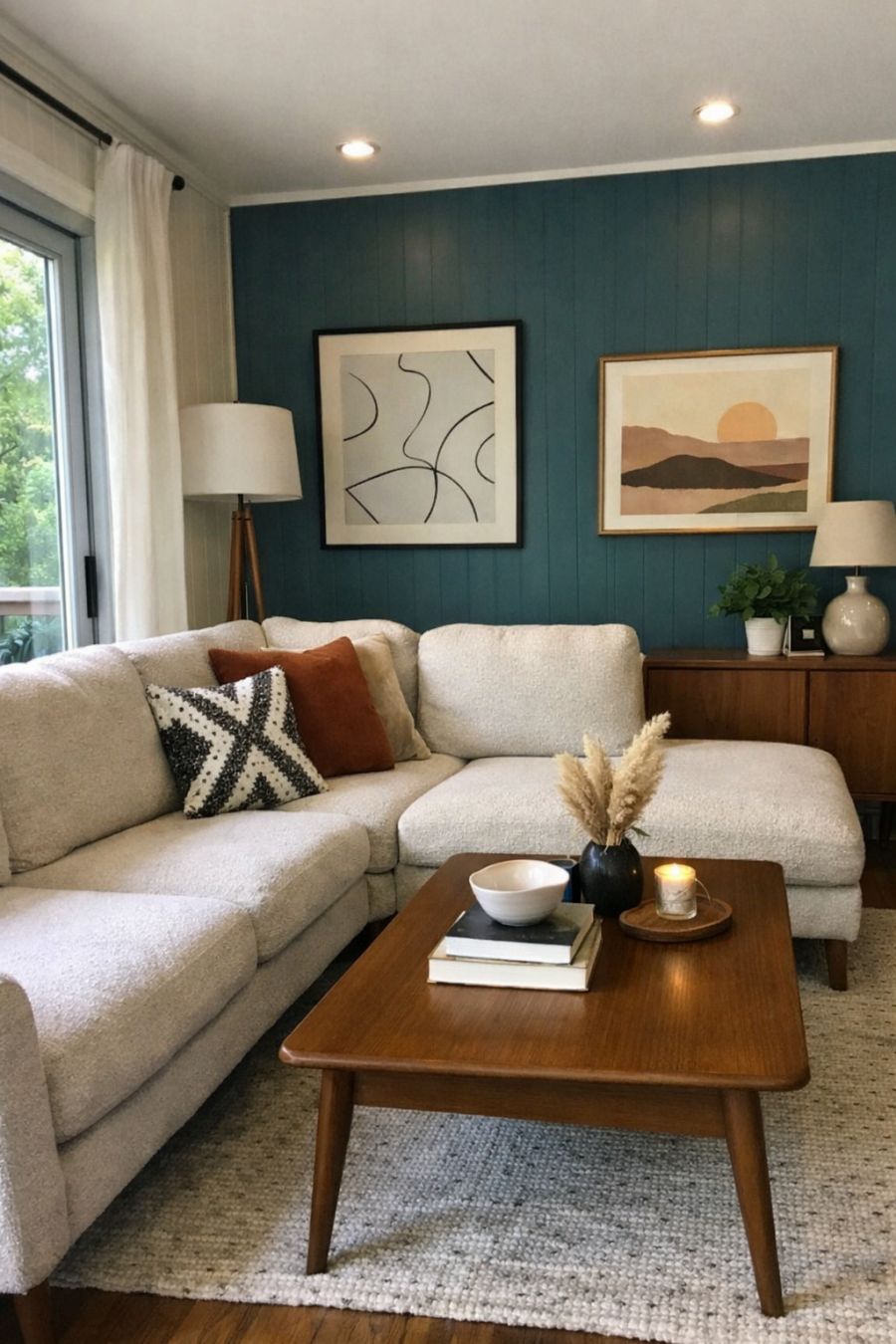 Step inside the living area, where contemporary elegance meets cozy comfort. The open-plan space is adorned with soft, neutral hues that complement the natural light streaming in through large windows, creating an airy and inviting atmosphere. Mid-century modern furniture pieces, including a plush sectional sofa and a sleek coffee table, provide both style and functionality. An accent wall, painted in a deeper shade of teal, adds depth and character to the room, while carefully curated art pieces offer a touch of sophistication. The living area is designed to be a versatile space, perfect for both relaxation and entertaining.