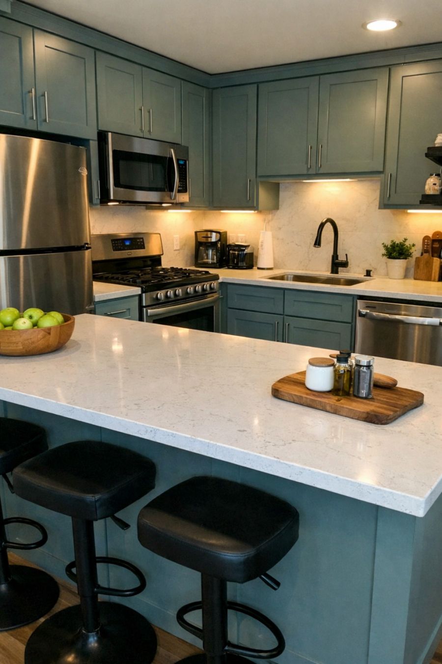The kitchen is a testament to modern design with its sleek lines and high functionality. Custom cabinetry in a muted teal tone provides ample storage while maintaining a clean and uncluttered look. The countertops, made of polished quartz, offer a durable and stylish workspace, complemented by stainless steel appliances that blend seamlessly into the design. A large island with bar seating invites casual gatherings and culinary creativity, while under-cabinet lighting adds a warm and inviting glow. This kitchen is not just a place to cook; it's a space that inspires culinary exploration and social interaction.