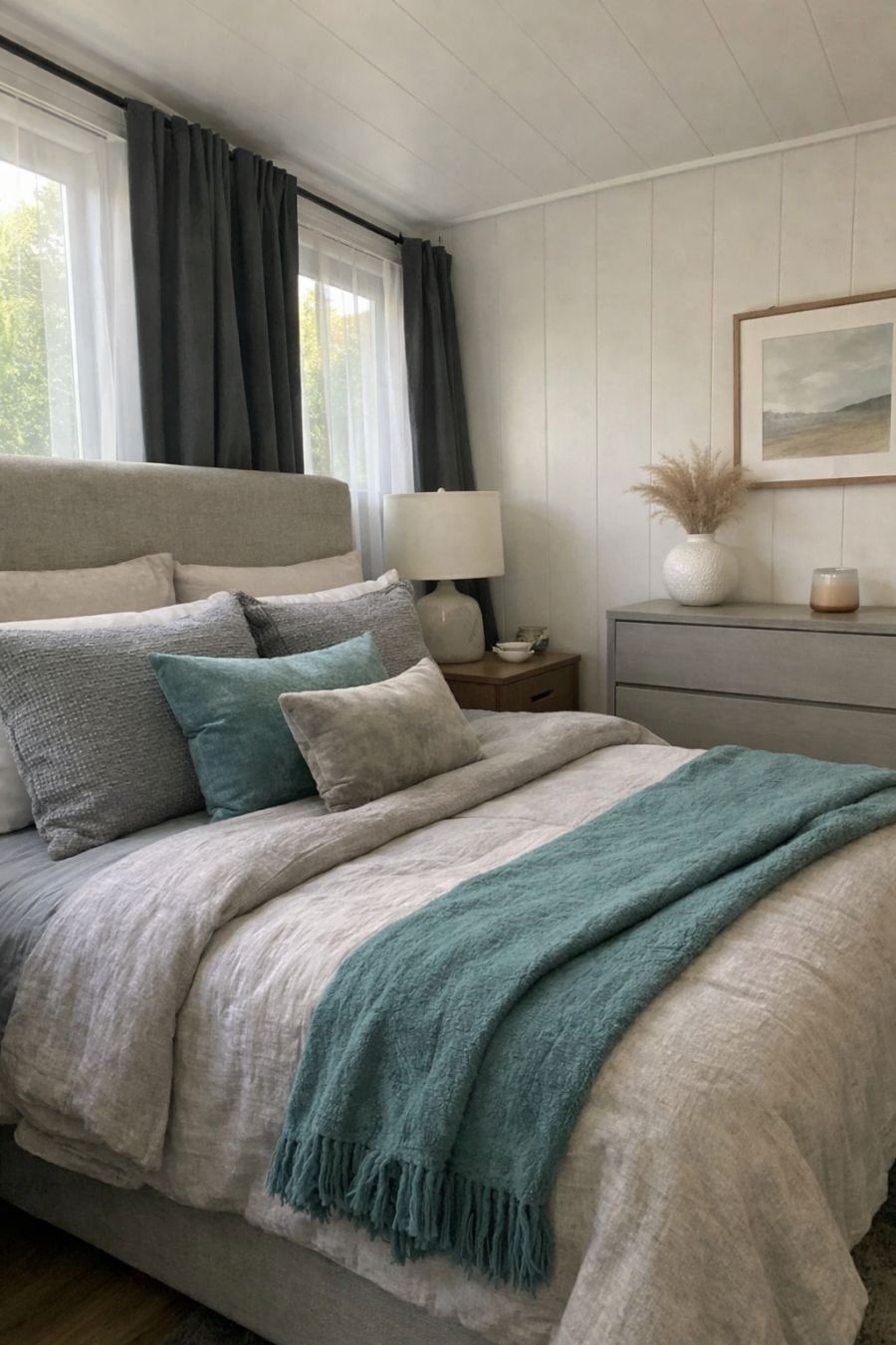 In the bedroom, tranquility and comfort reign supreme. A muted color palette of soft grays and teals creates a serene environment, perfect for unwinding after a long day. The centerpiece is a luxurious bed with layered textiles and plush pillows, offering a haven of relaxation. Large windows allow natural light to flood the room, while blackout curtains ensure restful sleep when desired. Minimalist furniture, including a streamlined dresser and bedside tables, provides functionality without sacrificing style. This bedroom is a restful retreat, thoughtfully designed to promote relaxation and rejuvenation.