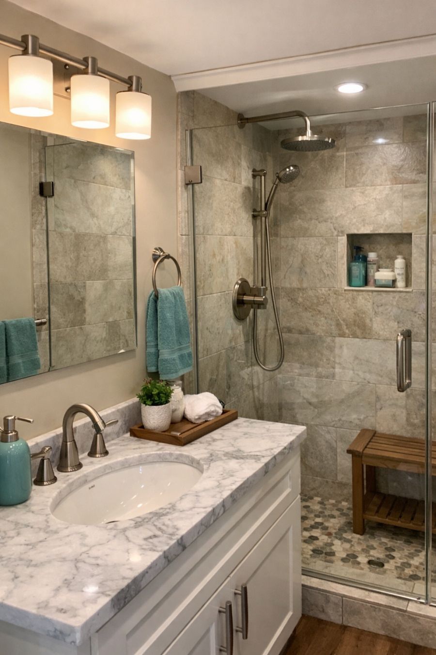 The bathroom is a harmonious blend of elegance and practicality, designed with both aesthetics and functionality in mind. Neutral tones dominate the color scheme, with subtle teal accents adding a touch of color. The vanity features a marble countertop and sleek fixtures, providing a stylish and functional space for daily routines. A spacious walk-in shower, enclosed in glass, offers a spa-like experience, while the use of natural stone tiles adds texture and sophistication. Thoughtful lighting enhances the space, creating a calming ambiance that makes the bathroom a perfect place to start and end your day.