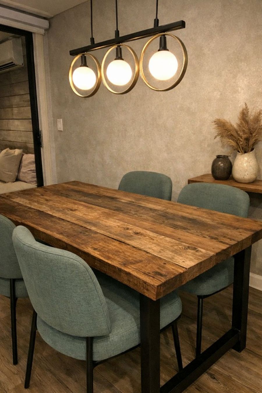 The dining area is a perfect blend of form and function, offering a seamless transition from the living space. A minimalist dining table, crafted from reclaimed wood, serves as the centerpiece, surrounded by elegant chairs with muted teal upholstery that ties the room together. Above, a contemporary pendant light fixture casts a warm glow, enhancing the intimate ambiance. The walls feature subtle textures and muted colors, creating a backdrop that allows the beauty of the dining furniture to stand out. This area is designed for memorable meals and meaningful conversations, making it an integral part of the home's communal experience.