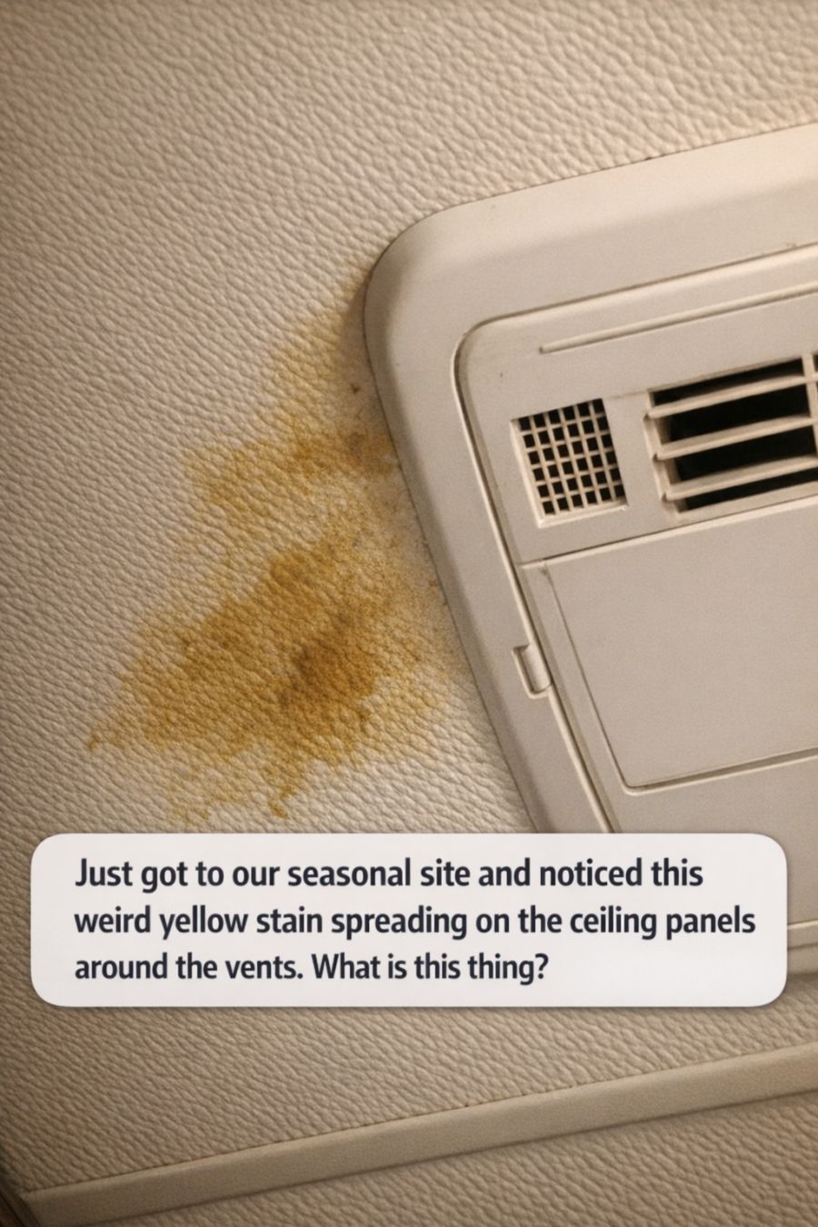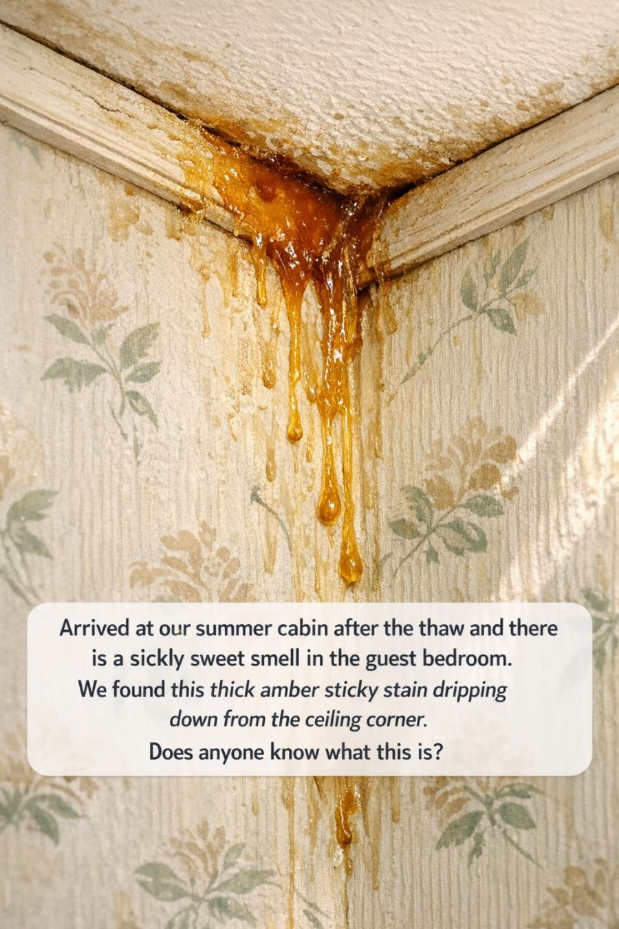 Arrived at our summer cabin after the thaw and there is a sickly sweet smell in the guest bedroom. We found this thick amber sticky stain dripping down from the ceiling corner. Does anyone know what t
