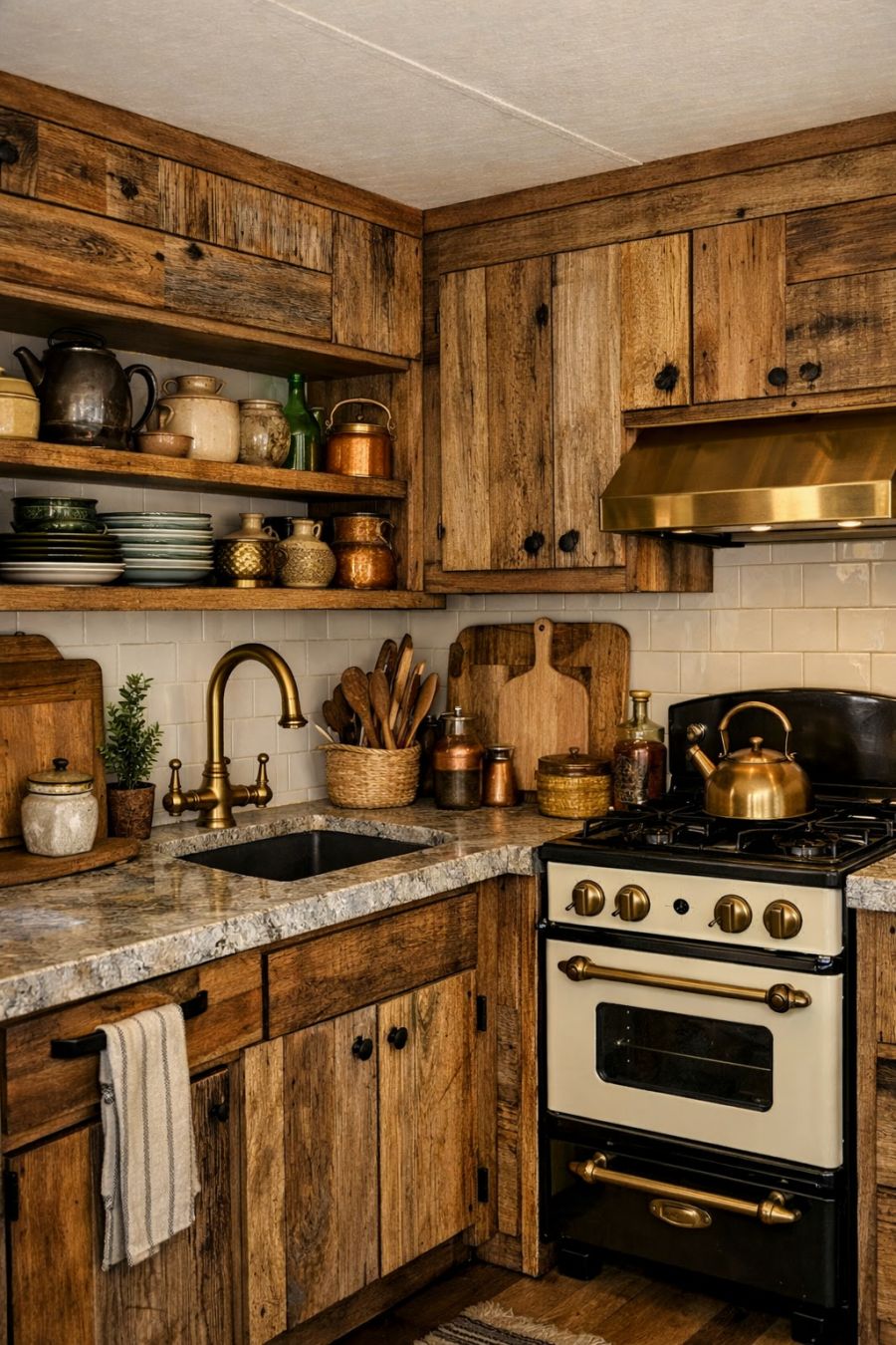 The kitchen area is a testament to the beauty and functionality of reclaimed materials. Reclaimed wood cabinets offer ample storage, their natural grain patterns adding visual interest and warmth. The countertops, crafted from polished stone, provide a durable and stylish workspace, while vintage brass fixtures add a touch of elegance. Open shelving displays an eclectic collection of antique dishware and cookware, infusing the space with character and charm. A small, vintage-inspired stove completes the kitchen, offering modern convenience with a nod to the past.