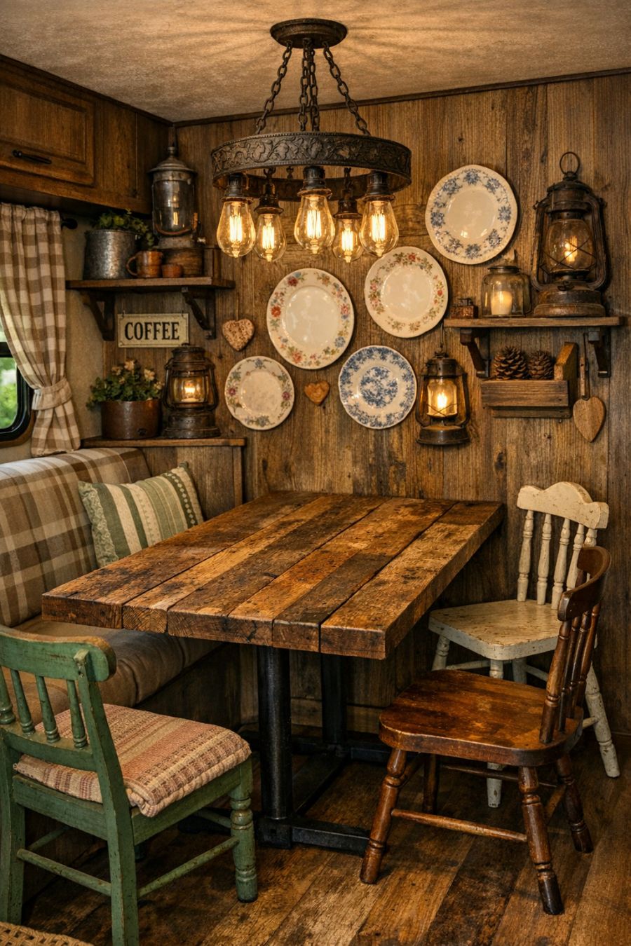 The dining area is a charming nook that harmoniously blends rustic and vintage elements. A handcrafted wooden table, made from reclaimed barn wood, serves as the centerpiece, surrounded by mismatched chairs that add character and charm. Above, a vintage chandelier with Edison bulbs provides a warm and welcoming light, perfect for intimate dinners or casual gatherings. The walls are adorned with antique plates and rustic decor, creating a space that feels both timeless and inviting.