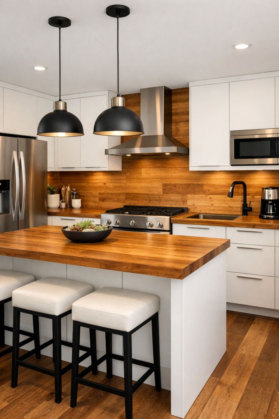 The kitchen area is a seamless blend of functionality and style, featuring a layout that caters to both cooking and entertaining. White cabinetry with clean lines and integrated handles ensures a clutter-free environment, while high-end stainless steel appliances add a touch of modern sophistication. A central island offers additional workspace and seating, doubling as a casual dining spot or a place for guests to gather. The use of natural materials, such as a wooden countertop and backsplash, introduces warmth and texture, balancing the sleekness of the overall design.