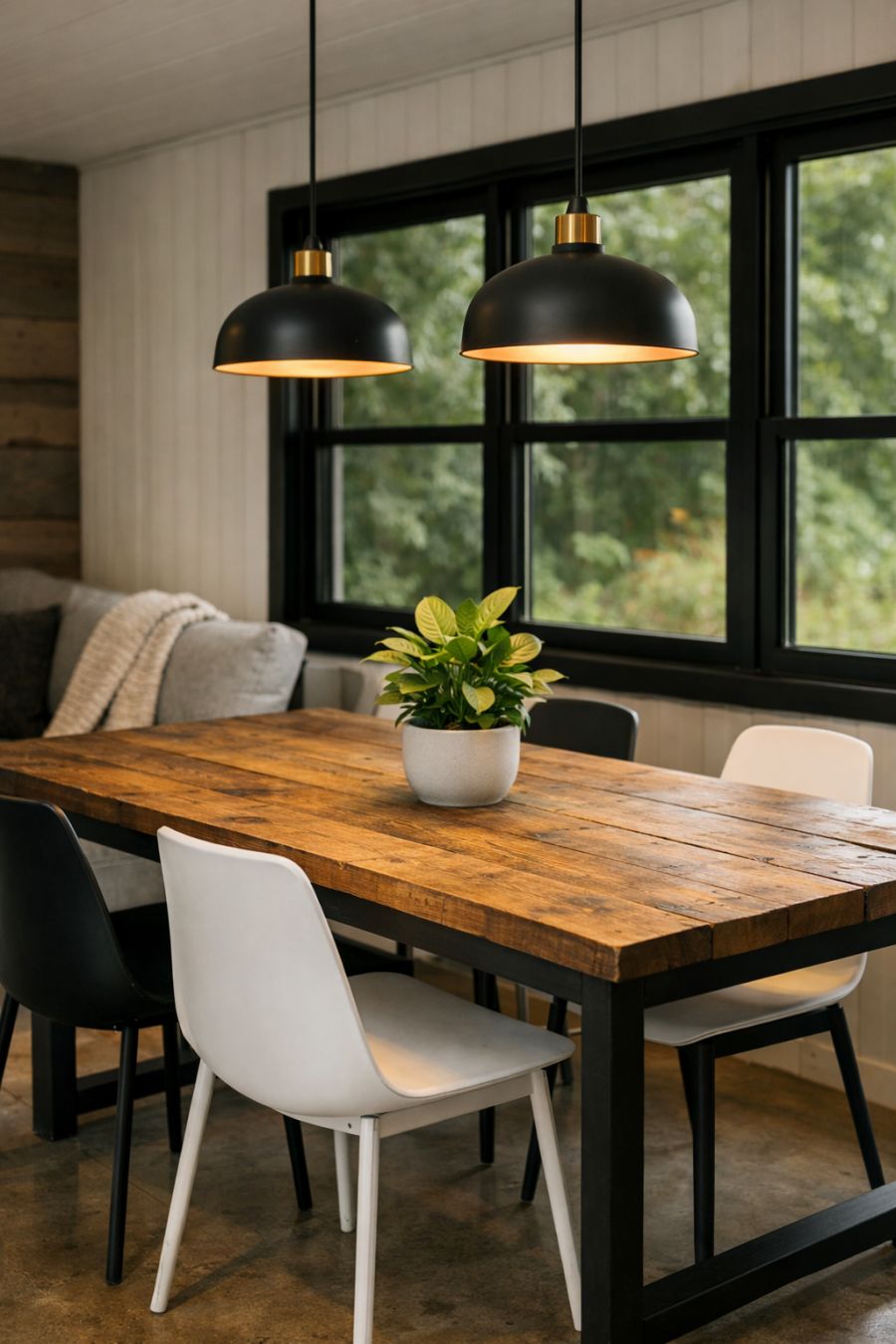 Adjacent to the living area, the dining space continues the theme of understated elegance. A sleek dining table made from reclaimed wood serves as the centerpiece, surrounded by modern chairs with simple, streamlined designs. The black-framed windows provide a visual link to the exterior, while pendant lighting above the table casts a warm glow, creating an inviting atmosphere for meals. The minimalist décor is punctuated by a single potted plant on the table, adding a touch of nature and vibrancy to the otherwise serene space.