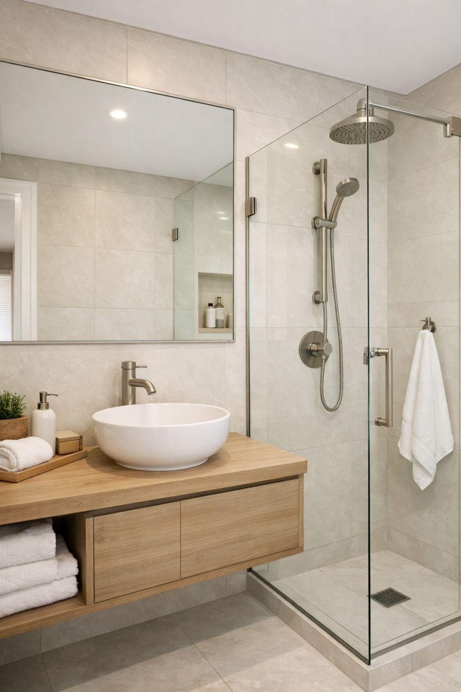 The bathroom is a sanctuary of calm, boasting a design that focuses on clean lines and natural materials. The walls and floor are clad in large, light-colored tiles, creating a seamless look that enhances the sense of space. A sleek vanity with a vessel sink combines elegance with practicality, while a frameless glass shower enclosure maintains the openness of the design. Fixtures in brushed metal add a touch of sophistication, and a large mirror reflects light, amplifying the airy feel of the room. The color scheme and materials work together to provide a space that is both functional and aesthetically pleasing.