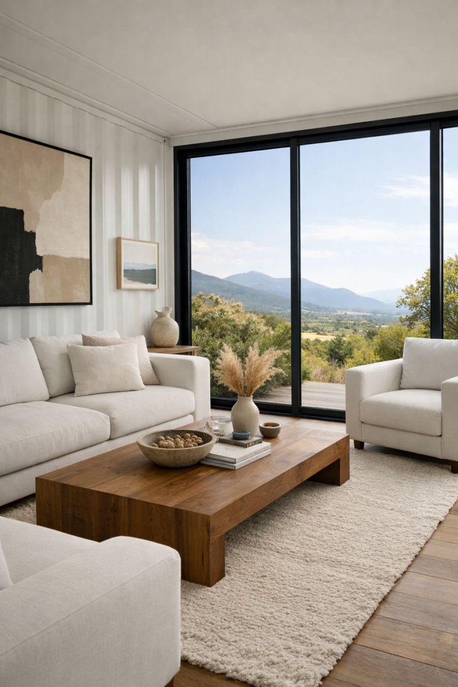 The living area of the home is a study in simplicity and comfort, with an open layout that emphasizes space and light. Neutral tones dominate the color scheme, with plush white sofas and armchairs offering a cozy place to relax, their clean lines complementing the minimalist theme. Accent pieces, such as a low-profile coffee table and a few strategically placed art pieces, add interest without overwhelming the space. The large floor-to-ceiling windows not only allow light to pour in but also offer stunning views of the surrounding landscape, making the living area feel both expansive and connected to the outdoors.