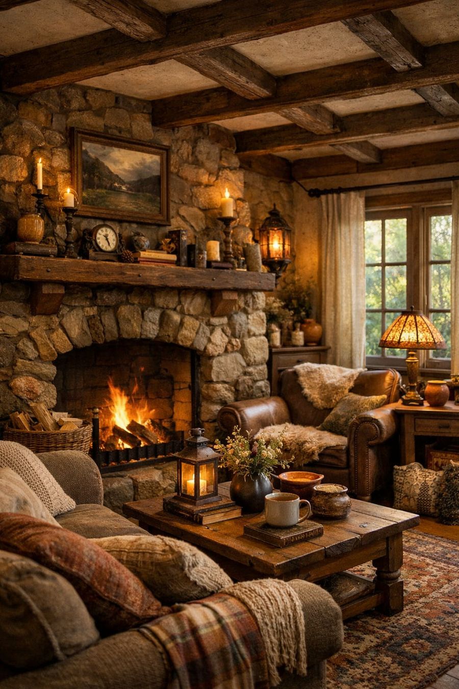Inside, the living area is a cozy haven filled with character and warmth. The space is anchored by a rustic stone fireplace, its mantle adorned with carefully curated trinkets and artifacts that tell a story of their own. Soft, plush furnishings in earthy tones create a welcoming environment, complemented by the gentle glow of vintage-inspired light fixtures. Wooden beams crisscross the ceiling, adding a touch of rustic charm and emphasizing the room's fairytale aesthetic. Large windows allow natural light to flood the space, creating an inviting atmosphere perfect for relaxation and reflection.