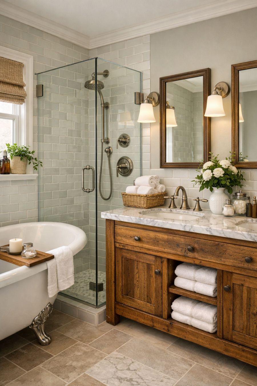 The bathroom is a sanctuary of style and functionality, featuring a harmonious blend of classic and contemporary design elements. Subway tiles in soft hues line the walls, creating a clean and timeless backdrop. A clawfoot tub, perfect for soaking, sits adjacent to a walk-in shower with elegant glass doors. The vanity, crafted from reclaimed wood, is topped with a marble countertop, providing a touch of luxury and sophistication. Fixtures in brushed nickel complement the overall aesthetic, while plush towels and botanical accents complete the space, offering a refreshing and rejuvenating atmosphere.