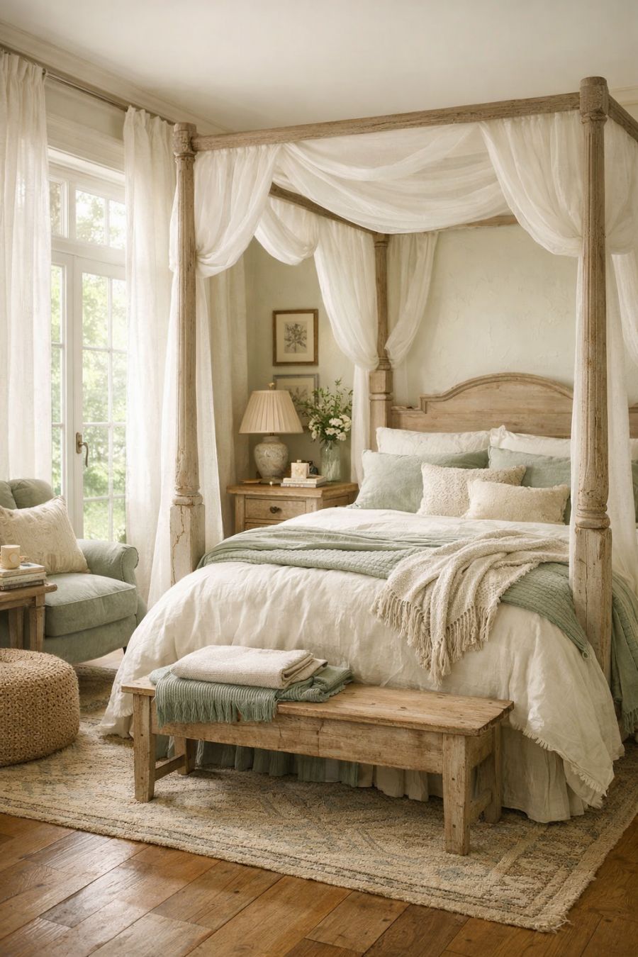 The bedroom is a serene retreat, designed to evoke a sense of calm and tranquility. Soft, muted colors in shades of sage and cream create a soothing palette, while plush textiles add layers of comfort. A four-poster bed, draped in delicate linens, serves as the room's centerpiece, inviting restful slumber. Natural light streams through floor-to-ceiling windows, highlighting the subtle textures and patterns found throughout the space. Thoughtful touches, such as a cozy reading nook and a vintage vanity, enhance the room's charm, making it a perfect haven for relaxation.