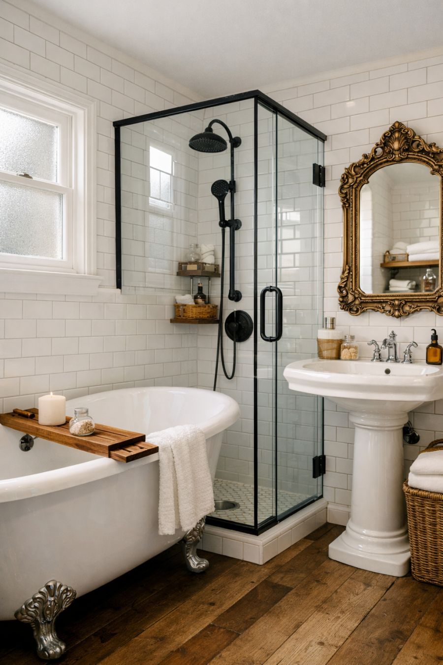 The bathroom continues the home's theme of combining vintage charm with modern amenities. The space features a classic clawfoot tub, perfect for unwinding after a long day, paired with a separate glass-enclosed shower for convenience. The walls are clad in white subway tiles, which reflect the natural light streaming in from a small, frosted window. A pedestal sink and a vintage mirror with an ornate frame add elegance, while open shelving offers practical storage solutions.