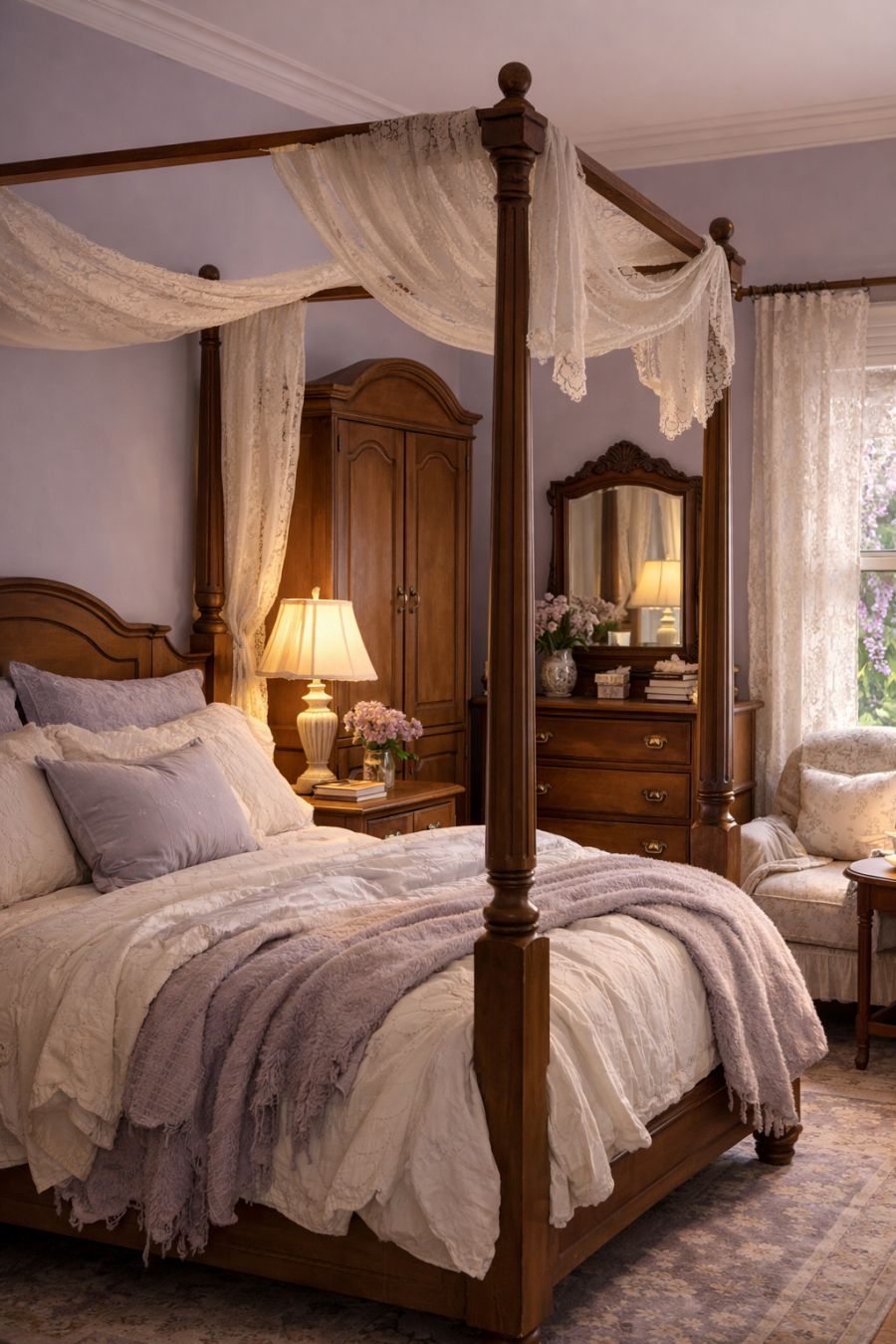 In the bedroom, serenity and comfort reign supreme. The space is dominated by a large, four-poster bed draped in soft, luxurious linens. The walls are painted in a calming pale lavender, echoing the hues of the wisteria outside and creating a peaceful retreat. An antique wardrobe and matching dresser provide ample storage, while a cozy reading nook by the window invites relaxation. Soft lighting from bedside lamps and a delicate lace curtain add to the room's tranquil, inviting ambiance.