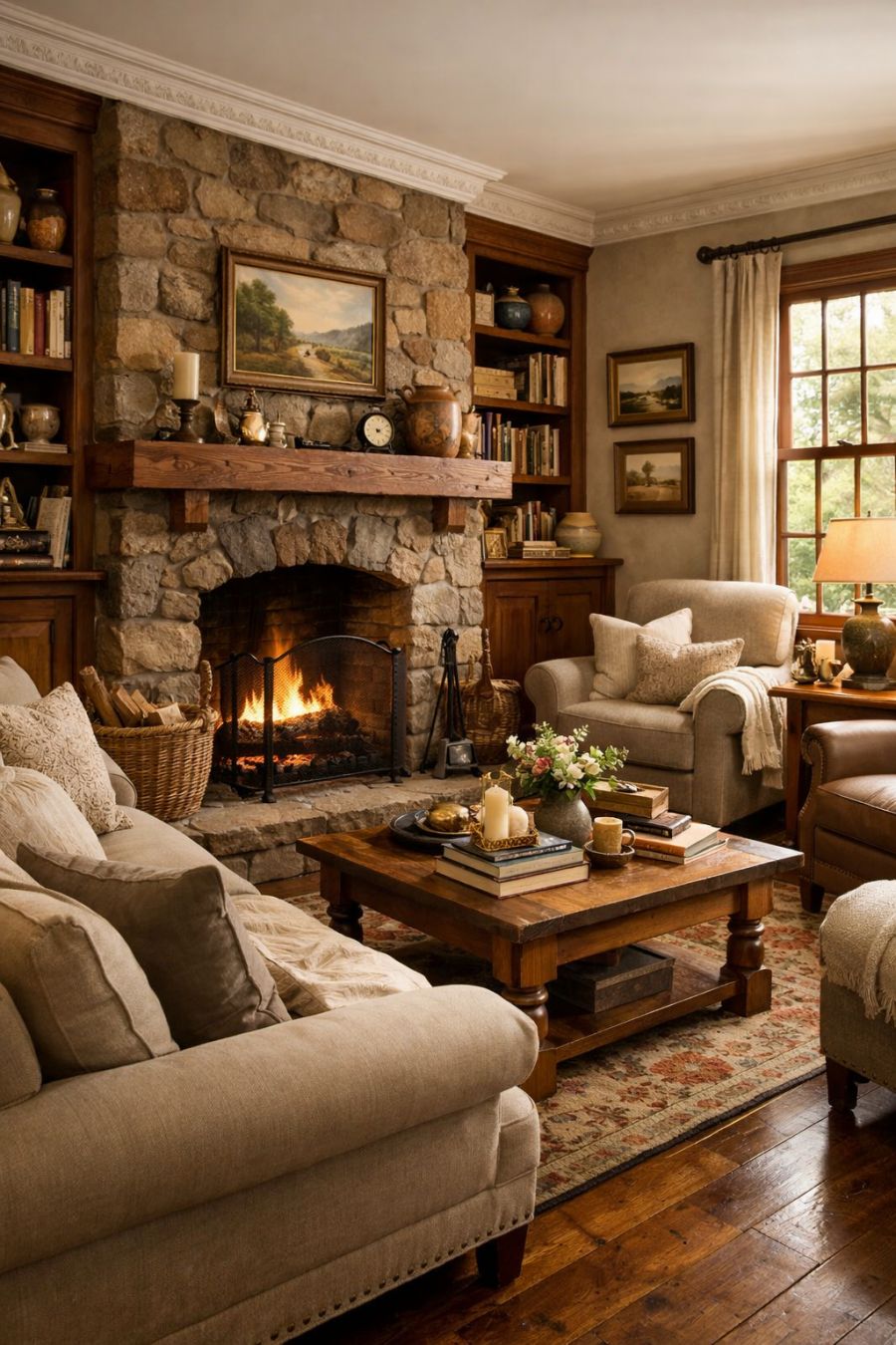 Inside, the living area exudes a cozy charm that is both inviting and sophisticated. The space is anchored by a vintage stone fireplace, around which plush, neutral-toned sofas and armchairs are arranged to encourage conversation and relaxation. The walls are adorned with curated art pieces and shelves displaying an array of books and trinkets, adding personal touches to the room. Natural light pours in through large, mullioned windows, casting a warm glow on the rich hardwood floors and highlighting the intricate details of the crown molding.