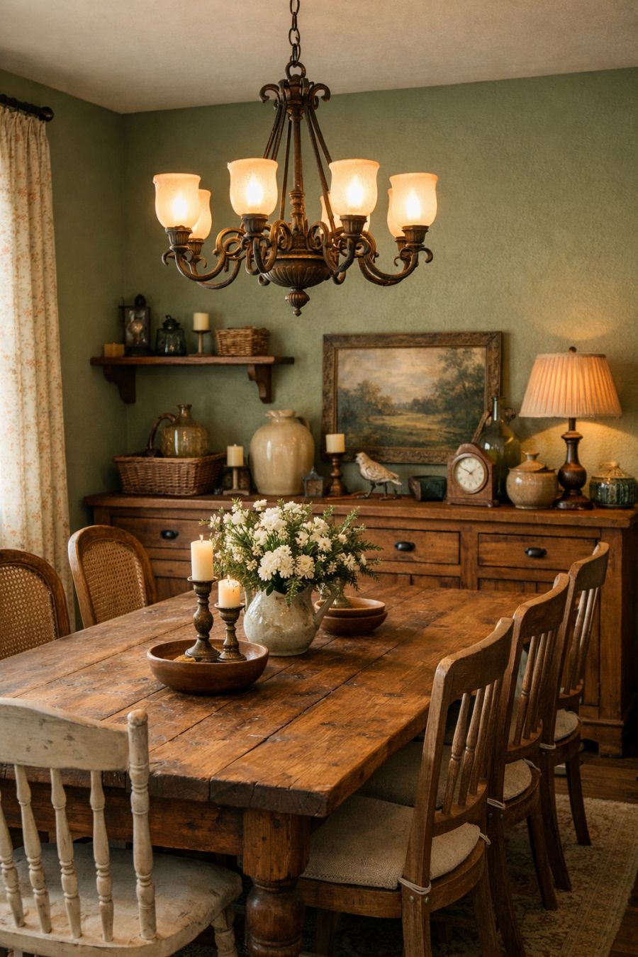 The dining area is a seamless extension of the living space, characterized by its rustic wooden table that comfortably seats six. Overhead, an antique chandelier casts a soft, inviting light, enhancing the room's intimate atmosphere. The walls are painted in a soothing sage green, complementing the natural wood tones and vintage-inspired dining chairs. A large sideboard against one wall provides storage for dinnerware and acts as a display for an eclectic collection of decorative items, bringing a personal touch to the space.