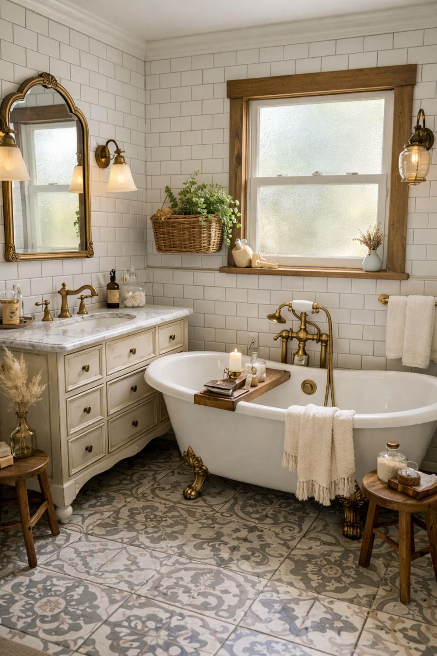 The bathroom is a sanctuary of relaxation, featuring a freestanding clawfoot bathtub as its centerpiece. The walls are clad in white subway tiles, providing a clean and classic backdrop. A vintage-inspired vanity with a marble countertop offers elegance and functionality, while brass fixtures add a touch of luxury. The floor is laid with patterned tiles in muted tones, adding visual interest without overwhelming the space. Natural light filters in through a frosted window, creating a bright and airy atmosphere.