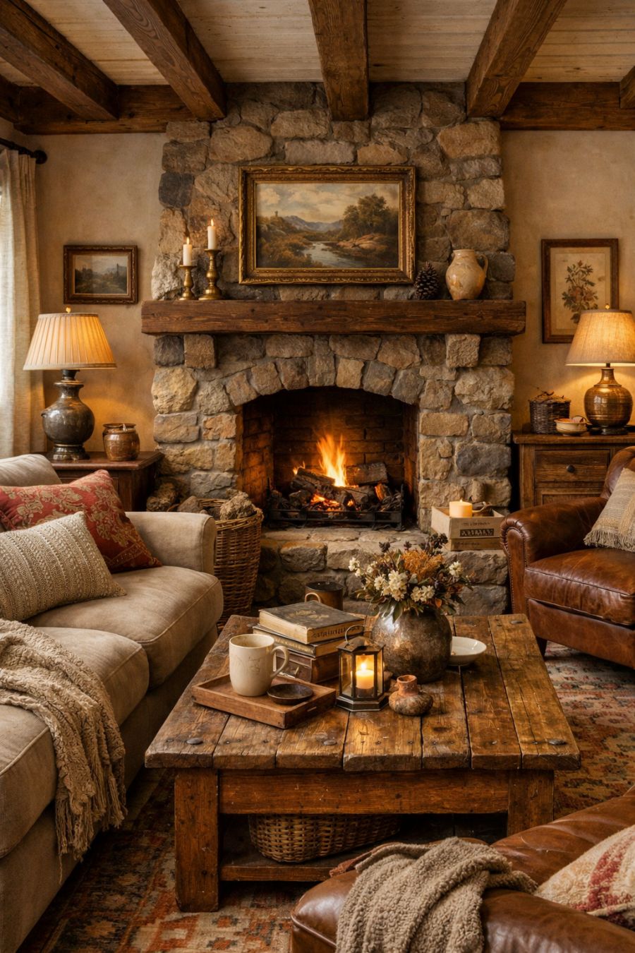 Stepping inside, the living area exudes warmth and rustic charm, with exposed wooden beams accentuating the high ceiling. The walls are adorned with soft, neutral hues that complement the natural light streaming through the large windows. A plush, oversized sofa invites relaxation, surrounded by vintage-inspired furniture pieces that add character to the space. The focal point is a stone fireplace, providing a cozy ambiance for chilly evenings. Thoughtfully curated artworks and cozy textiles complete the inviting atmosphere.