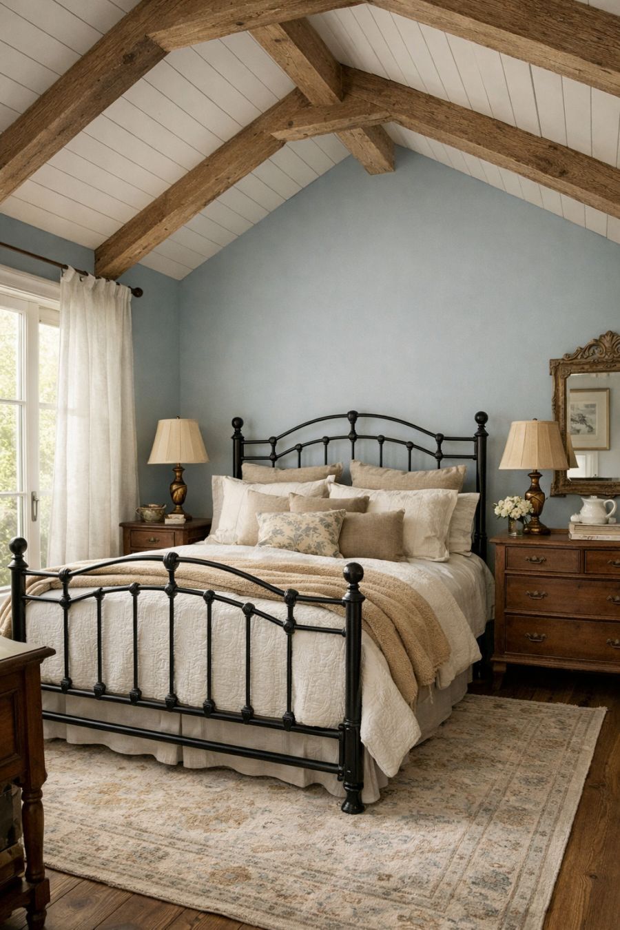 The bedroom is a serene retreat, featuring a vaulted ceiling with exposed beams that add architectural interest. The walls are a soothing shade of pale blue, creating a calming atmosphere perfect for rest. A wrought iron bed frame takes center stage, dressed in luxurious linens and an array of soft pillows. Antique bedside tables and a vintage dresser provide ample storage, while a plush area rug adds warmth underfoot. Large windows allow for plenty of natural light, with sheer curtains offering privacy without sacrificing brightness.