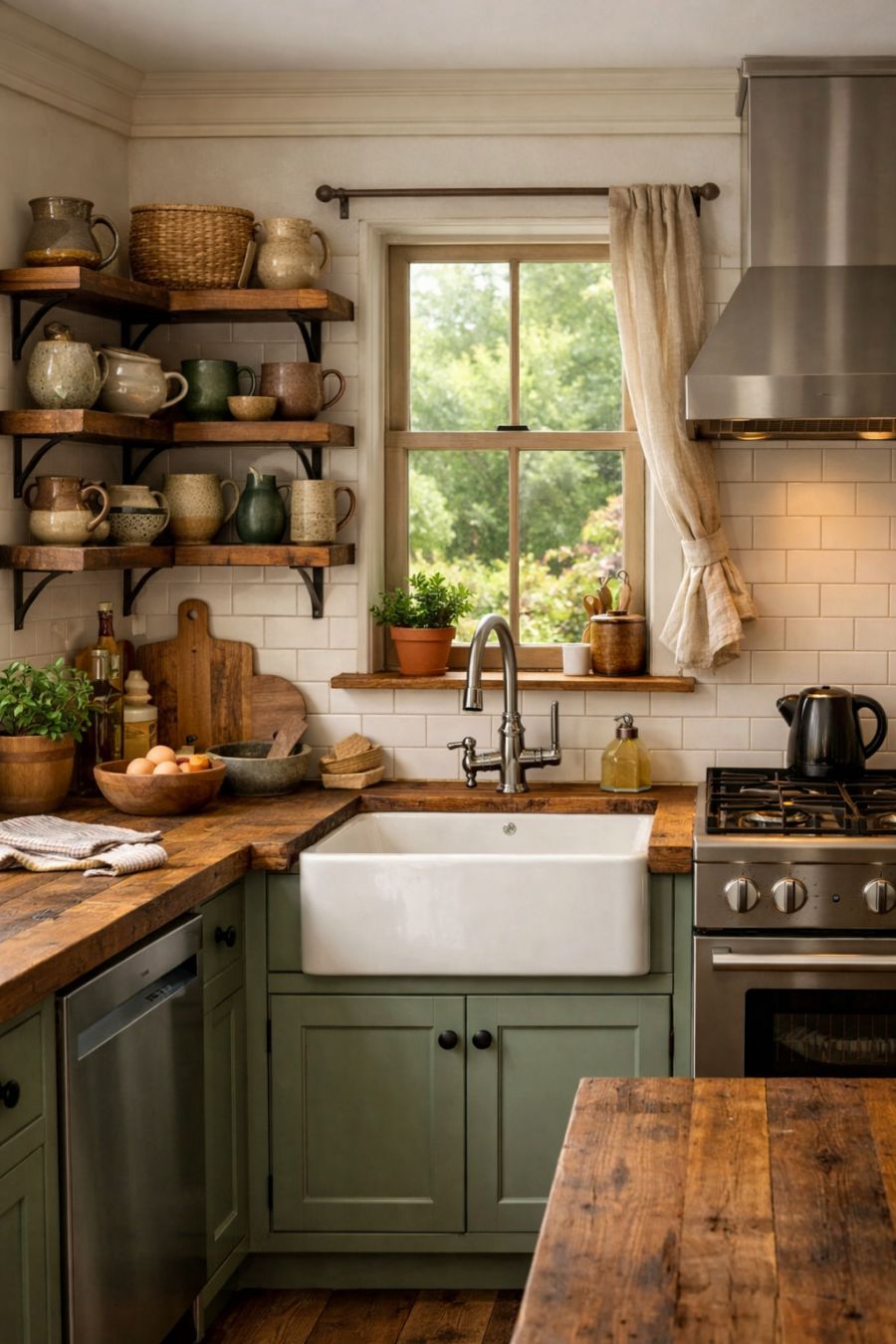 The kitchen is a delightful blend of functionality and style, with shaker-style cabinets painted in a soft sage green. Open shelving displays a collection of artisanal pottery, adding a personal touch to the space. The countertops are crafted from reclaimed wood, offering both durability and rustic appeal. A farmhouse sink sits under a large window, providing views of the garden while cooking. Modern appliances are seamlessly integrated into the design, ensuring that the kitchen is as practical as it is beautiful.