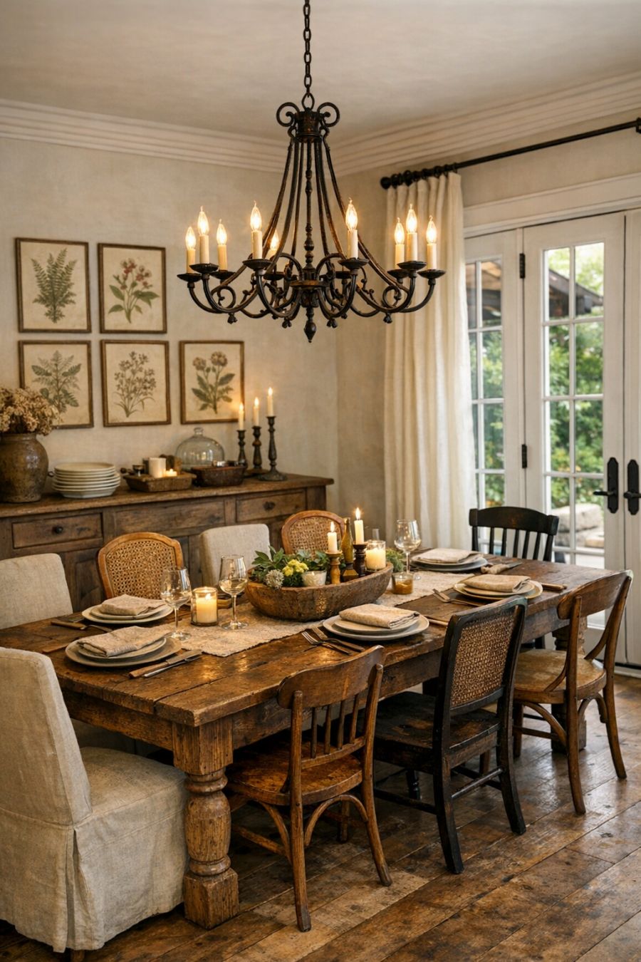The dining area continues the theme of rustic elegance, featuring a large wooden table that comfortably seats eight. The table is paired with a mix of vintage and modern chairs, creating an eclectic yet harmonious look. Above, a wrought iron chandelier casts a warm glow, enhancing the intimate dining experience. The walls are decorated with botanical prints, adding a touch of nature indoors. A sideboard along one wall provides ample storage for dinnerware, while a set of French doors open to the garden, allowing for al fresco dining in warmer months.