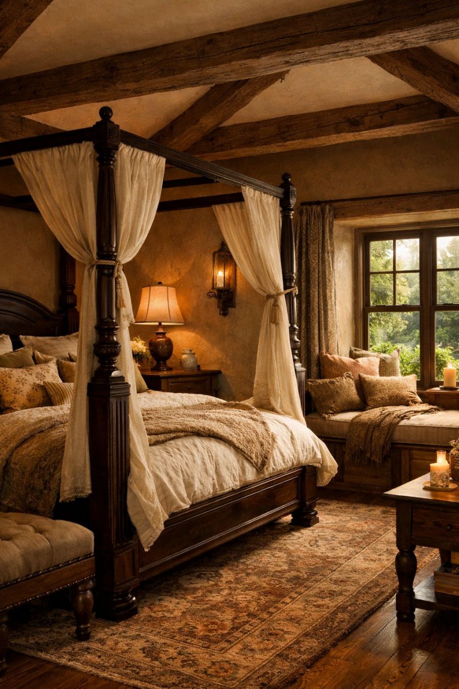 The bedroom is a sanctuary of comfort and style, where exposed beams and rich, textured fabrics create an inviting retreat. A grand, four-poster bed draped in luxurious linens takes pride of place, offering a perfect spot for restful slumber. Soft lighting and warm, earthy tones on the walls enhance the room's coziness, while a plush area rug adds warmth underfoot. A window seat provides a quiet corner for reflection, overlooking the lush garden below and allowing the outside beauty to seep into the peaceful interior.
