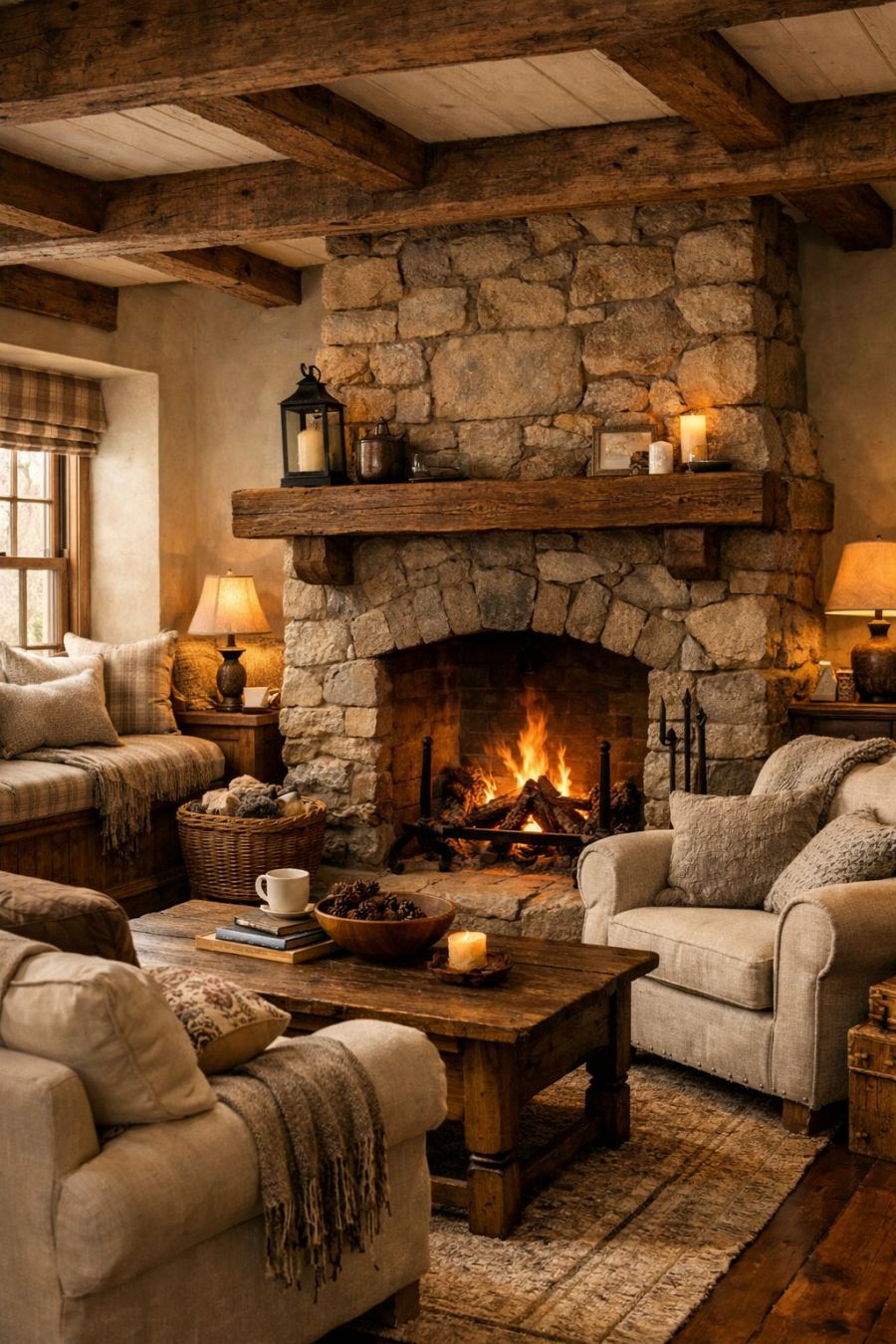 Upon entering, the living area greets you with a warm embrace, its exposed wooden beams stretching across the ceiling like the arms of an old friend. The room is anchored by a grand stone fireplace, an inviting focal point for gatherings or solitary relaxation. Soft, muted tones on the walls complement the natural wood elements, creating a serene and timeless atmosphere. Cozy nooks nestled beneath the windows offer perfect spots for reading or daydreaming, while plush furnishings invite you to sink in and unwind.