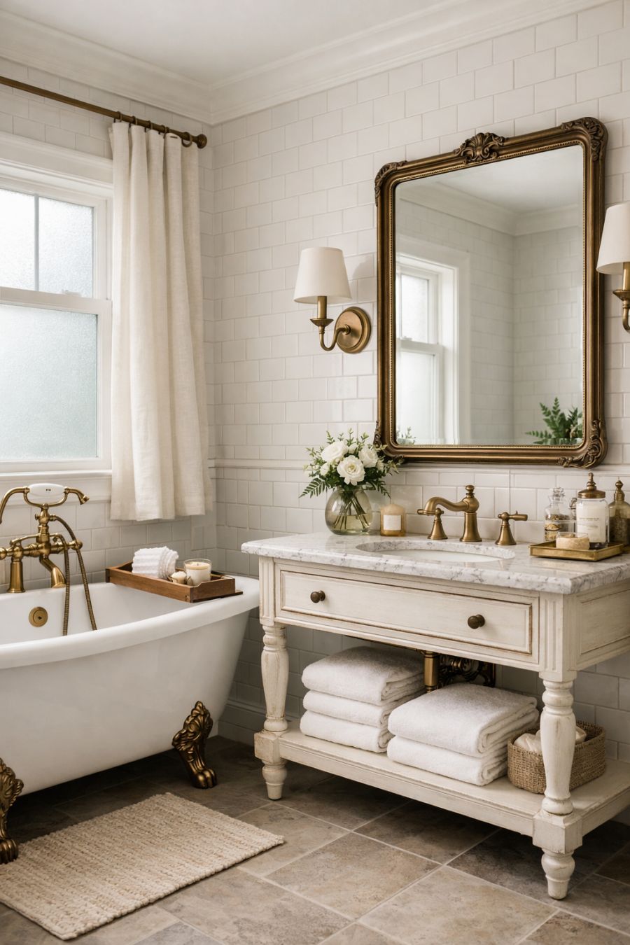 The bathroom is a study in understated elegance, featuring a harmonious blend of classic and contemporary elements. White subway tiles line the walls, providing a crisp, clean backdrop for the room's centerpiece: a freestanding clawfoot tub that invites long, luxurious soaks. A vintage-style vanity with a marble countertop and brushed brass fixtures adds a touch of opulence, while a large mirror reflects the soft, natural light that streams in through a frosted window. The neutral color palette, accented with touches of greenery, creates a tranquil atmosphere, perfect for relaxation and rejuvenation.