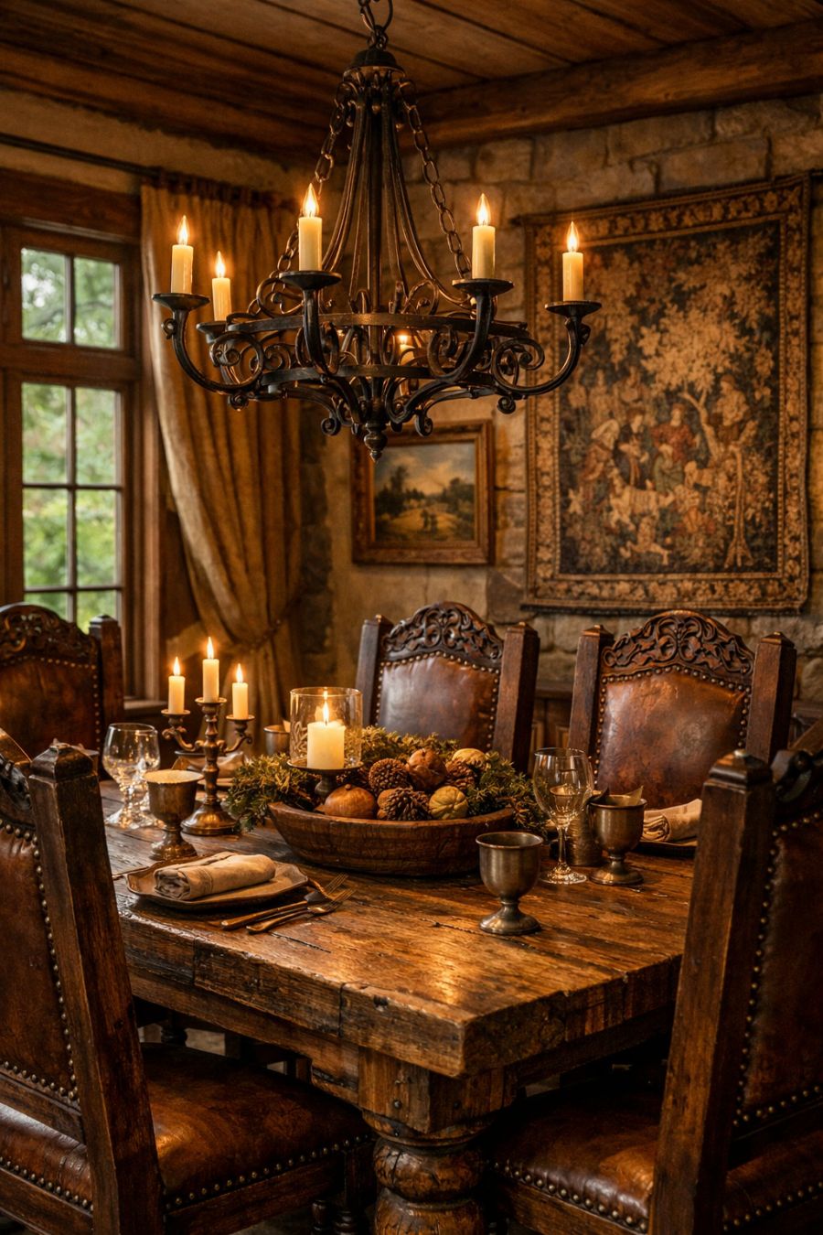 The dining area exudes a rustic elegance, where the charm of the past meets contemporary comfort. A large wooden table, crafted from reclaimed timber, takes center stage, surrounded by high-backed chairs with intricate carvings. Overhead, a wrought iron chandelier casts a warm glow, enhancing the intimate ambiance. Large windows allow natural light to flood the space during the day, while heavy drapes can be drawn for more intimate evening meals. The walls are adorned with vintage prints and tapestries, adding layers of texture and history to the room.