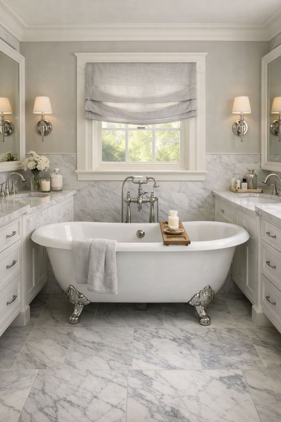 The bathroom is a sanctuary of relaxation and style, with its thoughtful design and high-quality materials. Marble tiles line the floors and walls, creating a sleek and sophisticated look, while a freestanding clawfoot tub offers a luxurious spot to unwind. Double vanities provide plenty of space for morning routines, with elegant fixtures and ample storage solutions. The color scheme is a blend of soft whites and gentle greys, creating a serene ambiance that is both refreshing and rejuvenating.