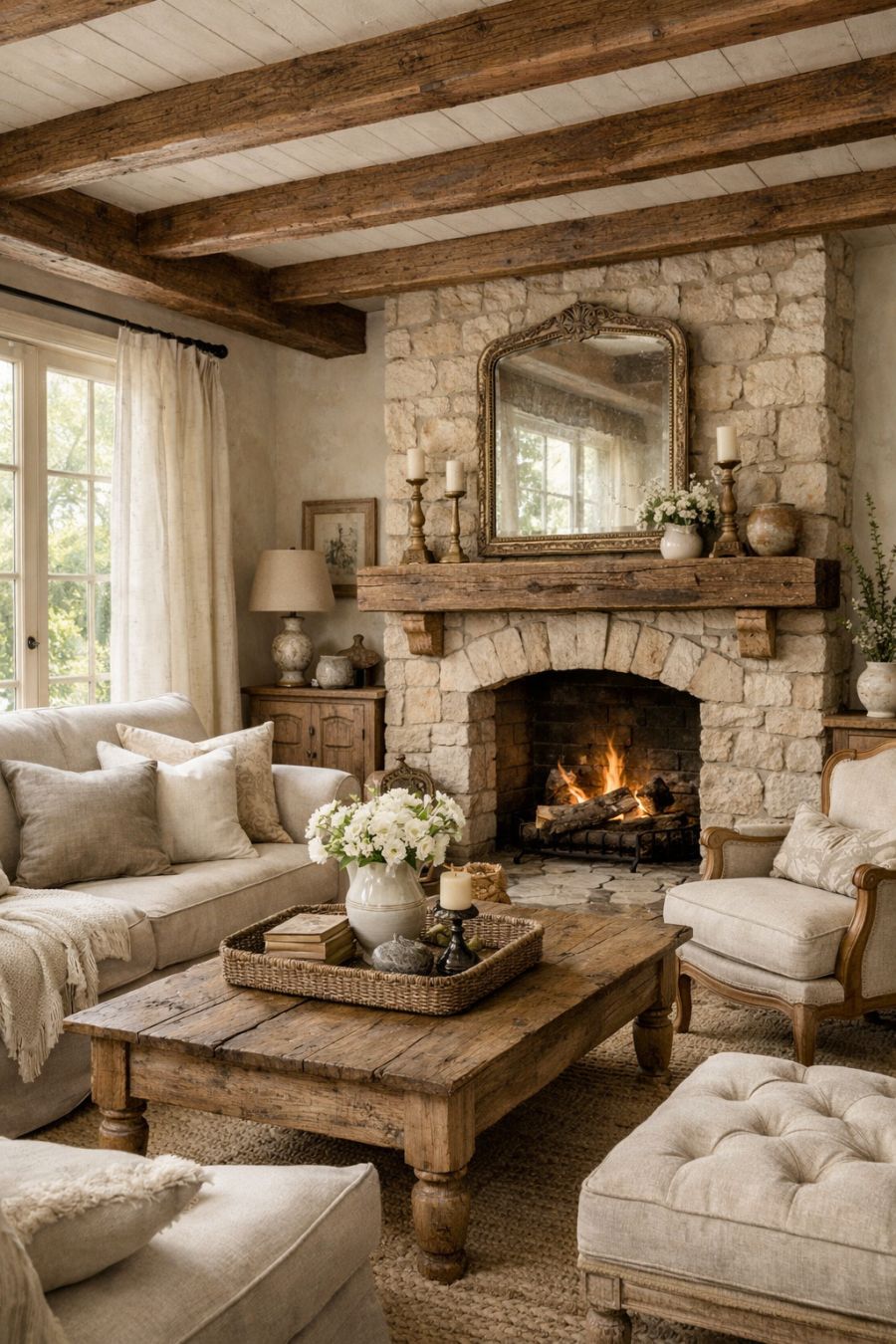 As you step inside, the living area greets you with a harmonious blend of rustic and refined elements, creating a cozy yet sophisticated atmosphere. Exposed wooden beams line the ceiling, adding character and warmth, while a stone fireplace serves as the focal point, inviting you to relax and unwind. Soft, neutral tones dominate the color palette, accented by plush textiles and vintage-inspired furnishings that echo the charm of the French countryside. Large windows flood the space with natural light, enhancing the airy feel and providing picturesque views of the surrounding gardens.