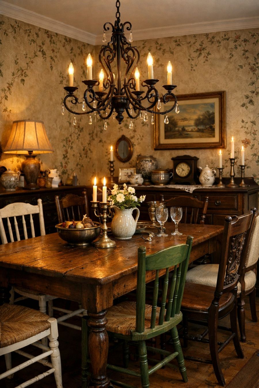 The dining area exudes elegance with its antique wooden table, surrounded by mismatched chairs that add a touch of whimsy and personality. A wrought-iron chandelier hangs overhead, casting a warm glow that enhances the intimate ambiance of the space. The walls are adorned with delicate floral patterns, a nod to the natural beauty outside, while a sideboard provides both storage and a display area for cherished family heirlooms. This room is perfect for hosting both intimate gatherings and festive celebrations, where laughter and good food are always in abundance.