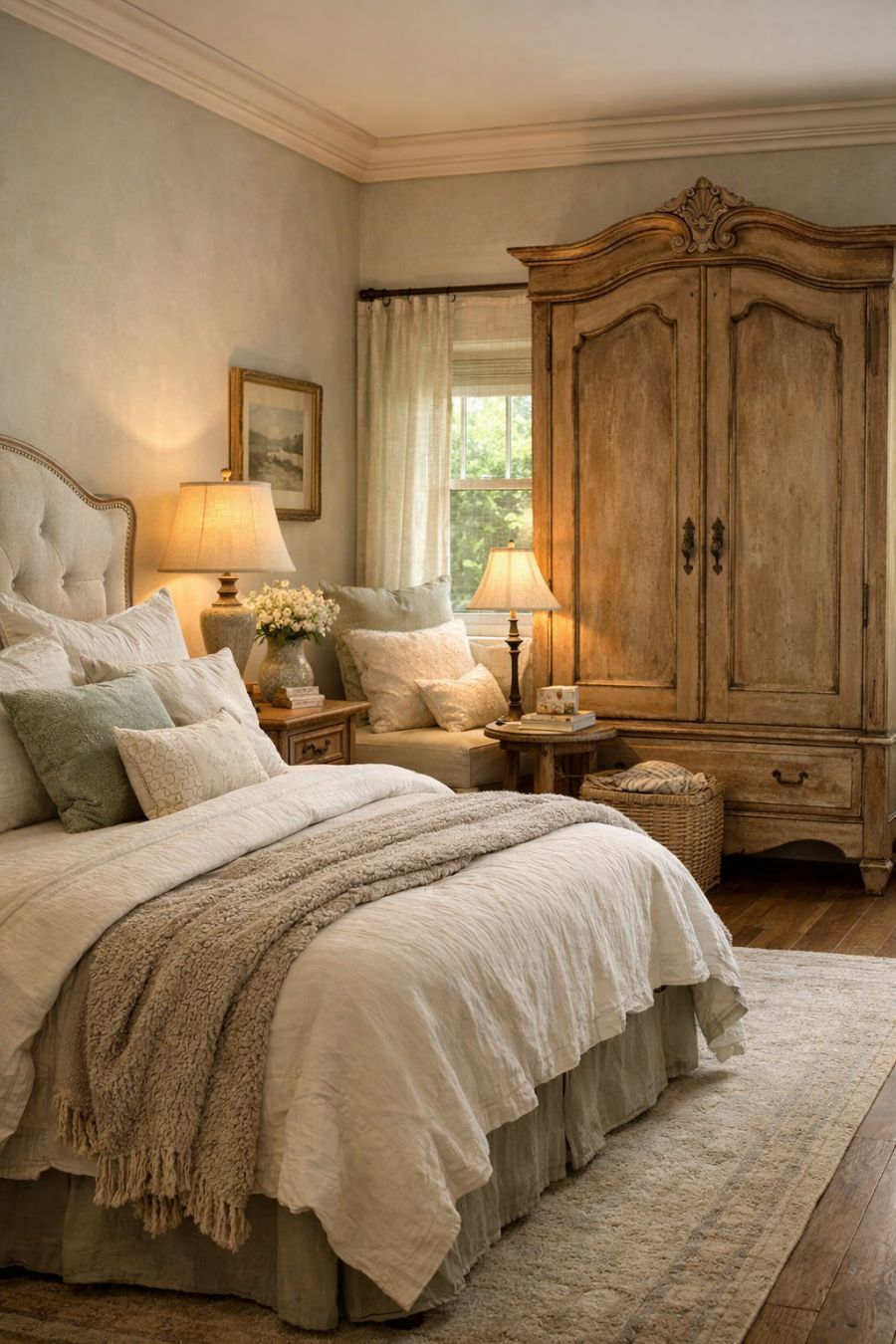 The bedroom is a serene retreat, designed to provide the utmost comfort and tranquility. Soft, muted colors create a calming atmosphere, while luxurious linens and plush pillows invite restful slumber. An antique armoire provides ample storage and a touch of vintage elegance, while a cozy reading nook by the window offers a perfect spot to unwind with a good book. The room is filled with natural light during the day, and at night, soft lighting creates a soothing ambiance that is perfect for relaxation.
